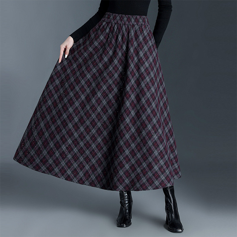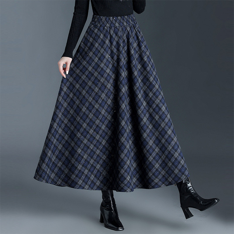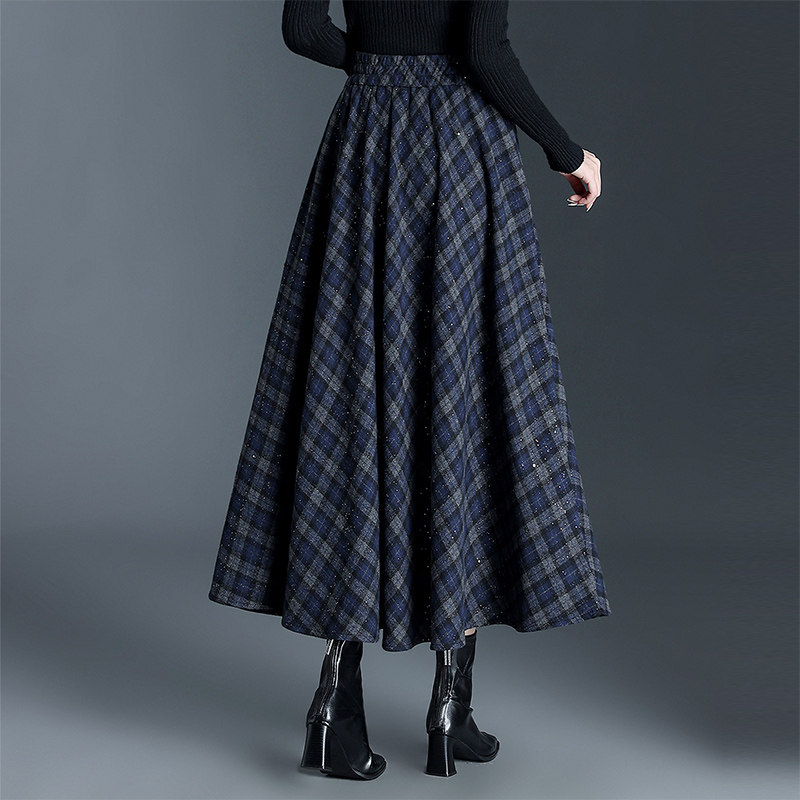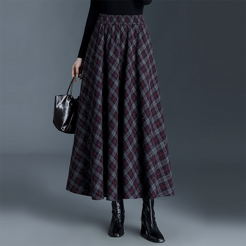 复古格纹毛呢长裙a字裙女秋冬2025新款松紧腰亮片显瘦大摆半身裙