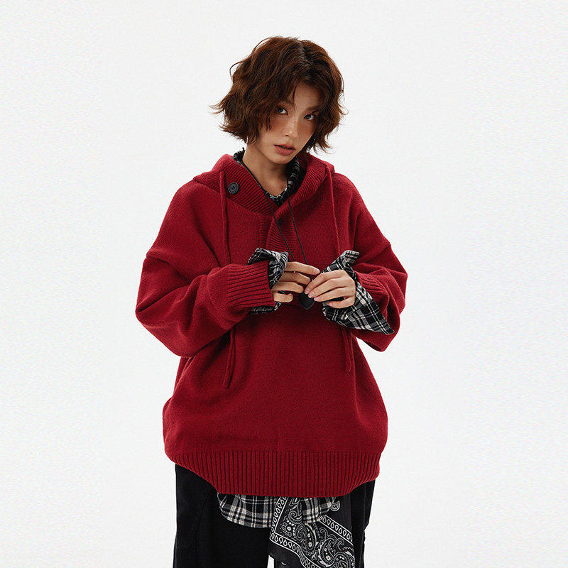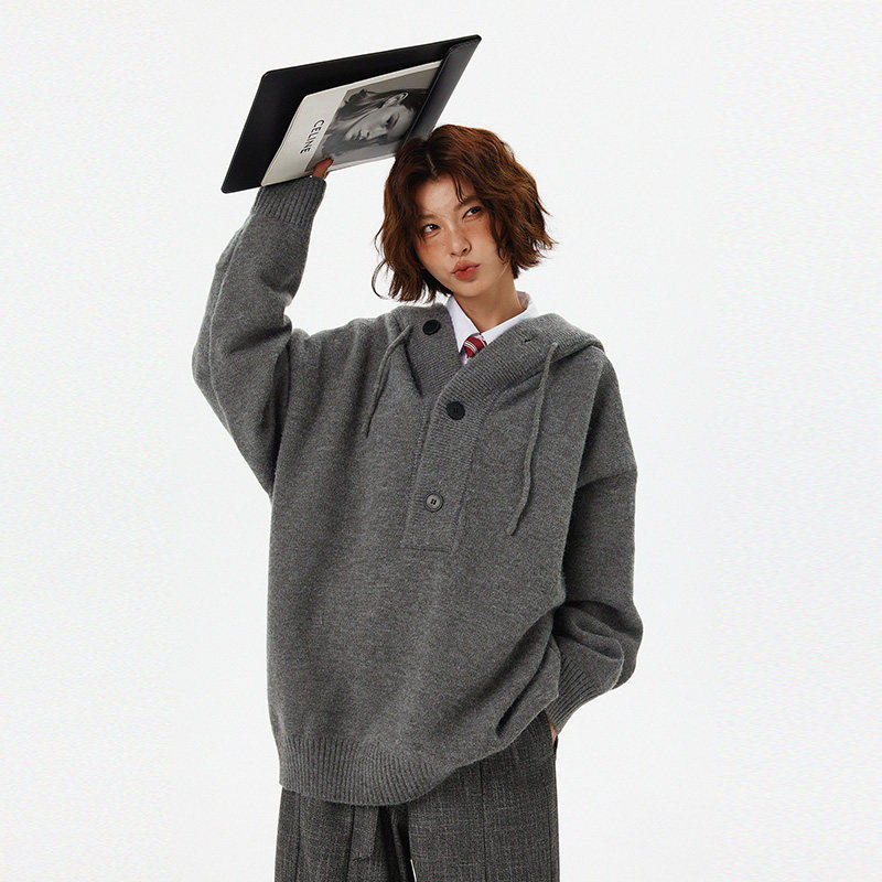 达蒙岛美式覆古慵懒风半开衫钮扣连帽毛衣男女宽松情侣针织衫外套