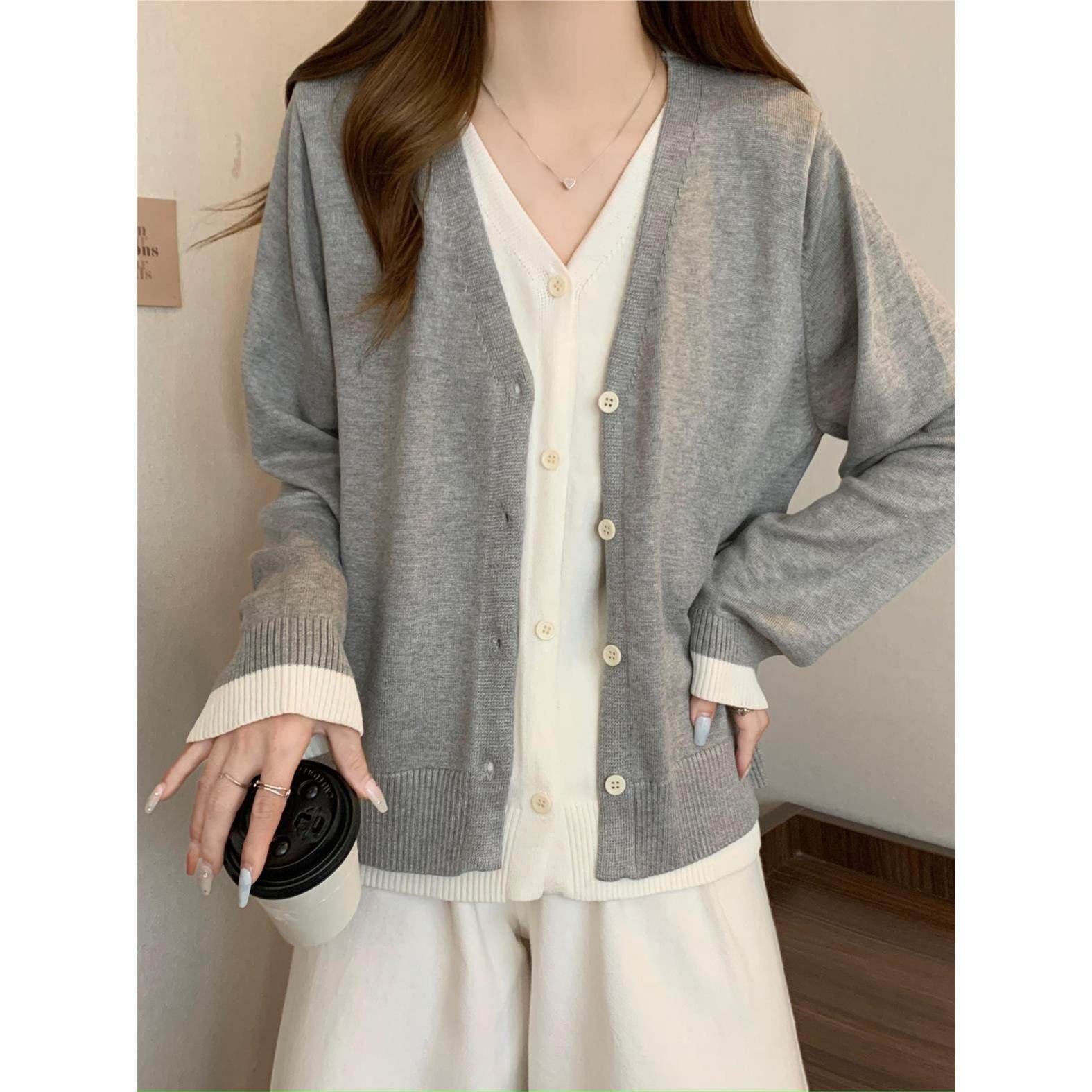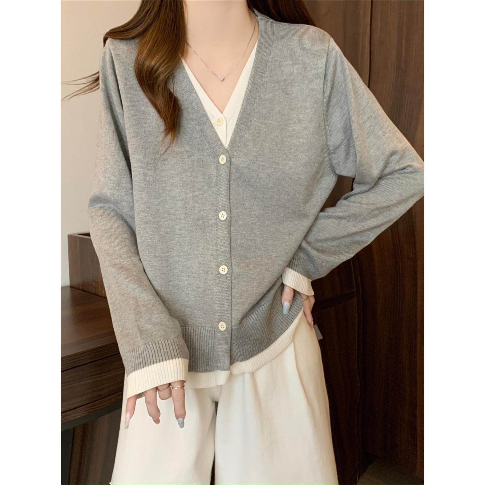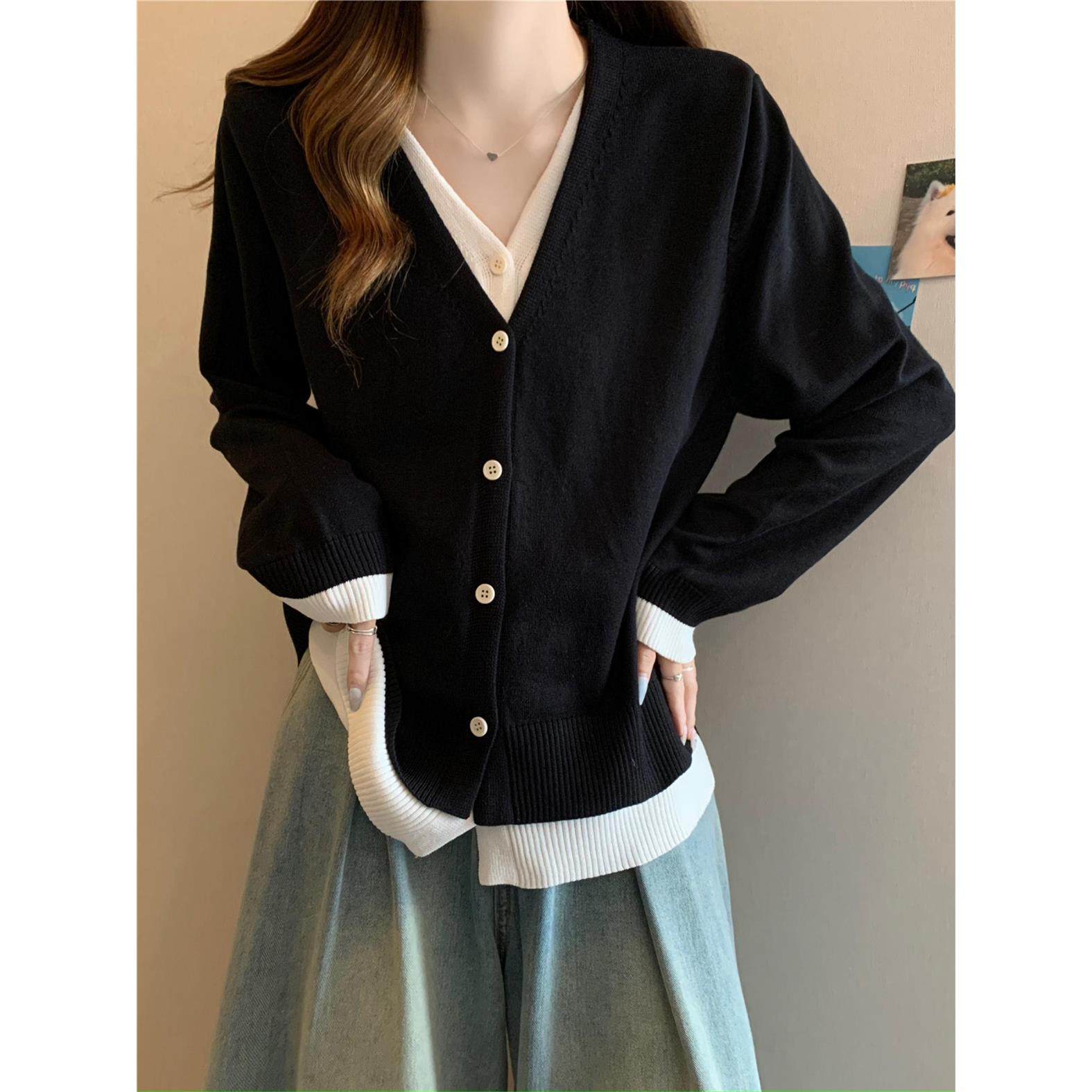 大码女装假两件v领针织衫女春秋宽松显瘦遮肚子正肩上衣毛衣开衫