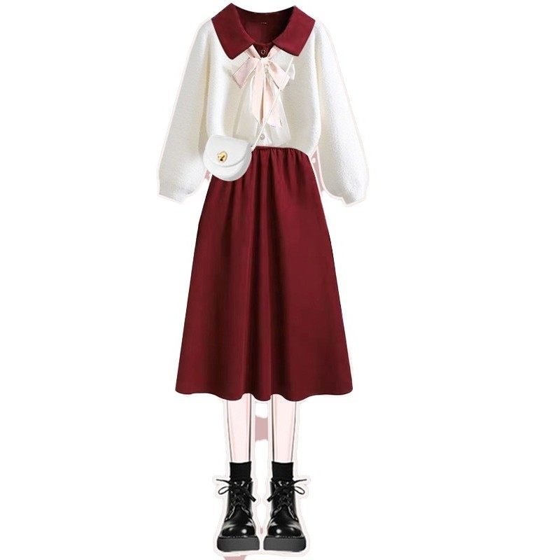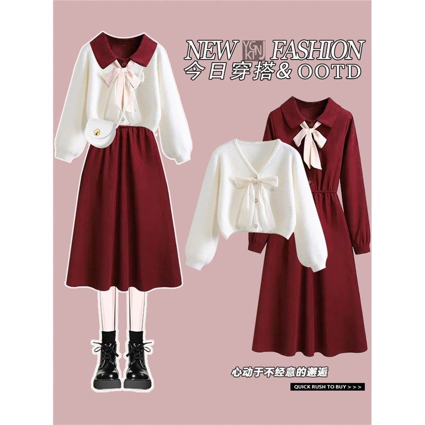 法式覆古polo领红色连衣裙女秋季新款收腰设计感针织开衫毛衣套装