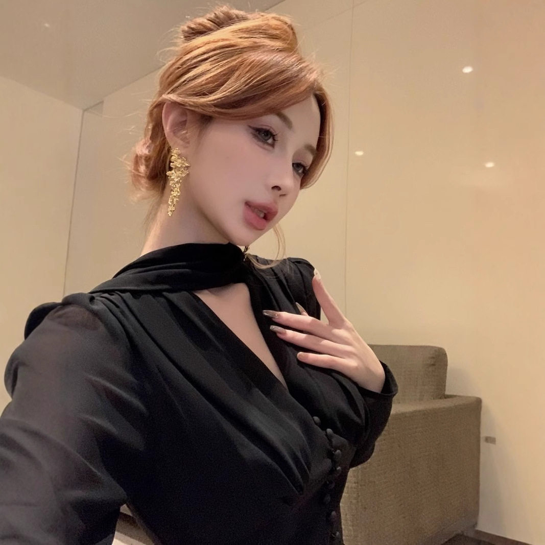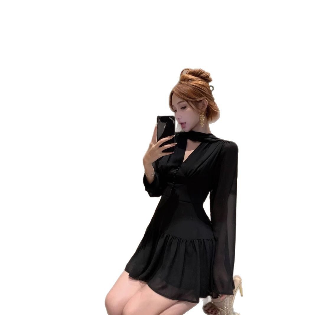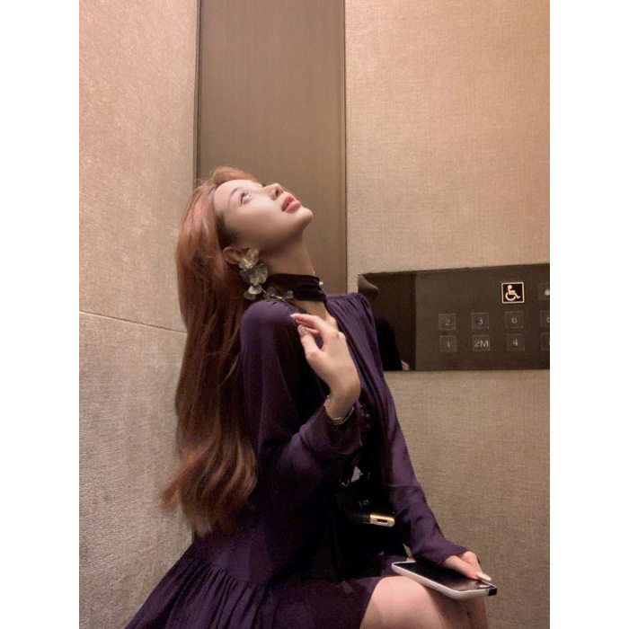 紫色v领长袖雪纺连衣裙女早秋修身气质短裙御姐轻熟风收腰a字裙子