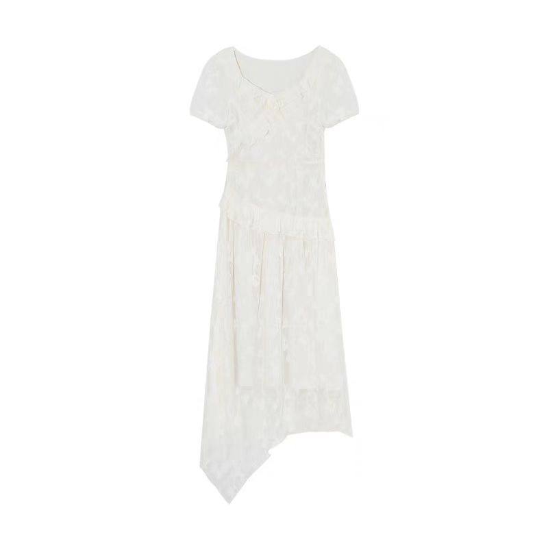 2024夏新款法式方领设计感小众气质荷叶边收腰显瘦不规则连衣裙女