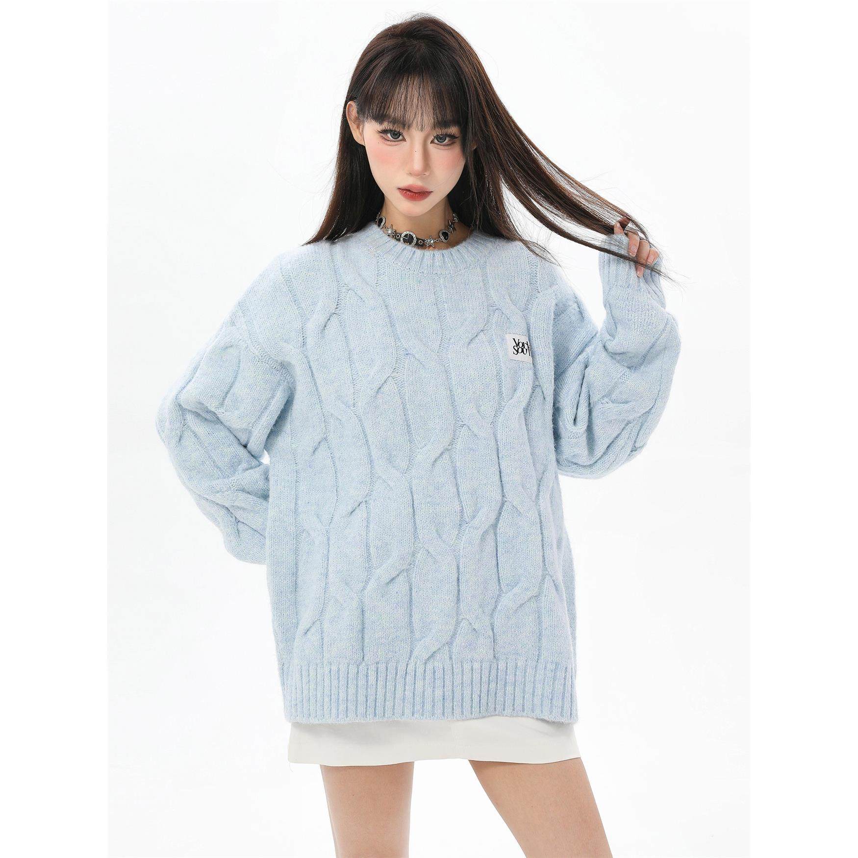 蓝色麻花针织毛衣女冬季穿搭软糯慵懒加厚正肩内搭针织衫上衣秋冬