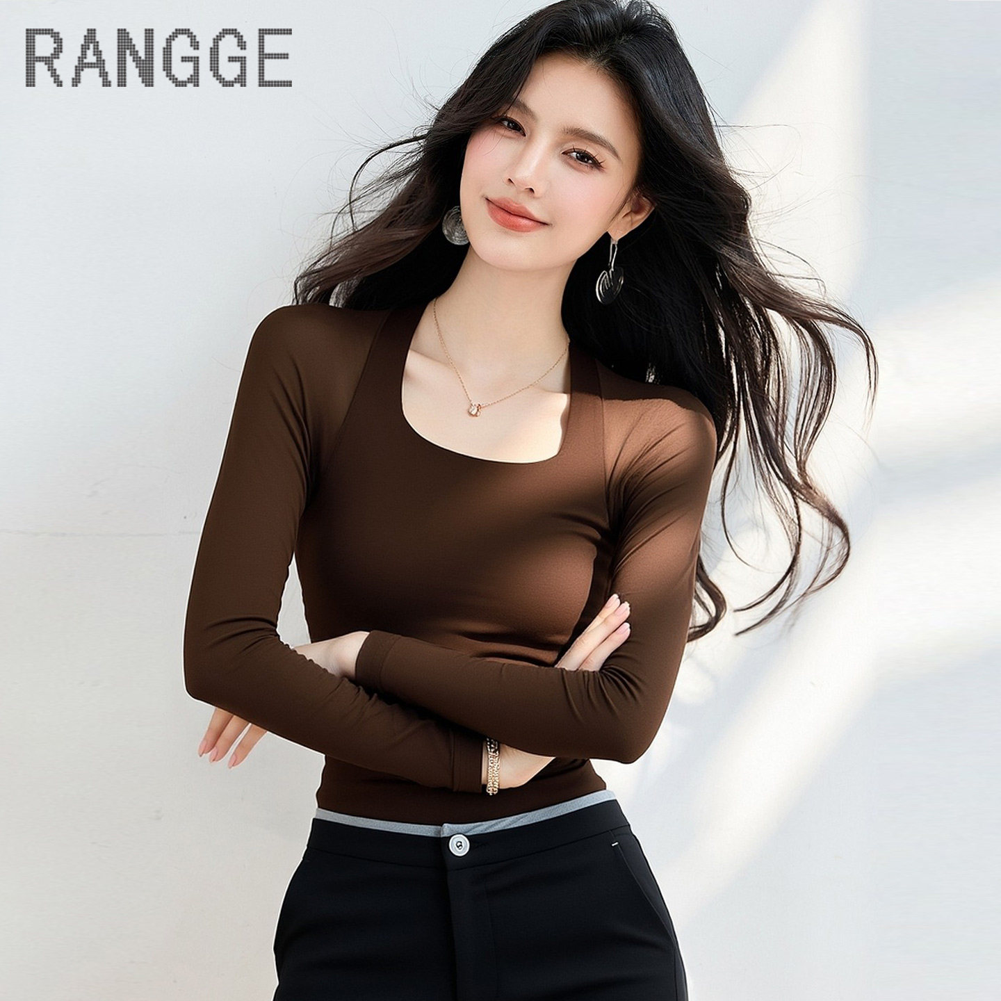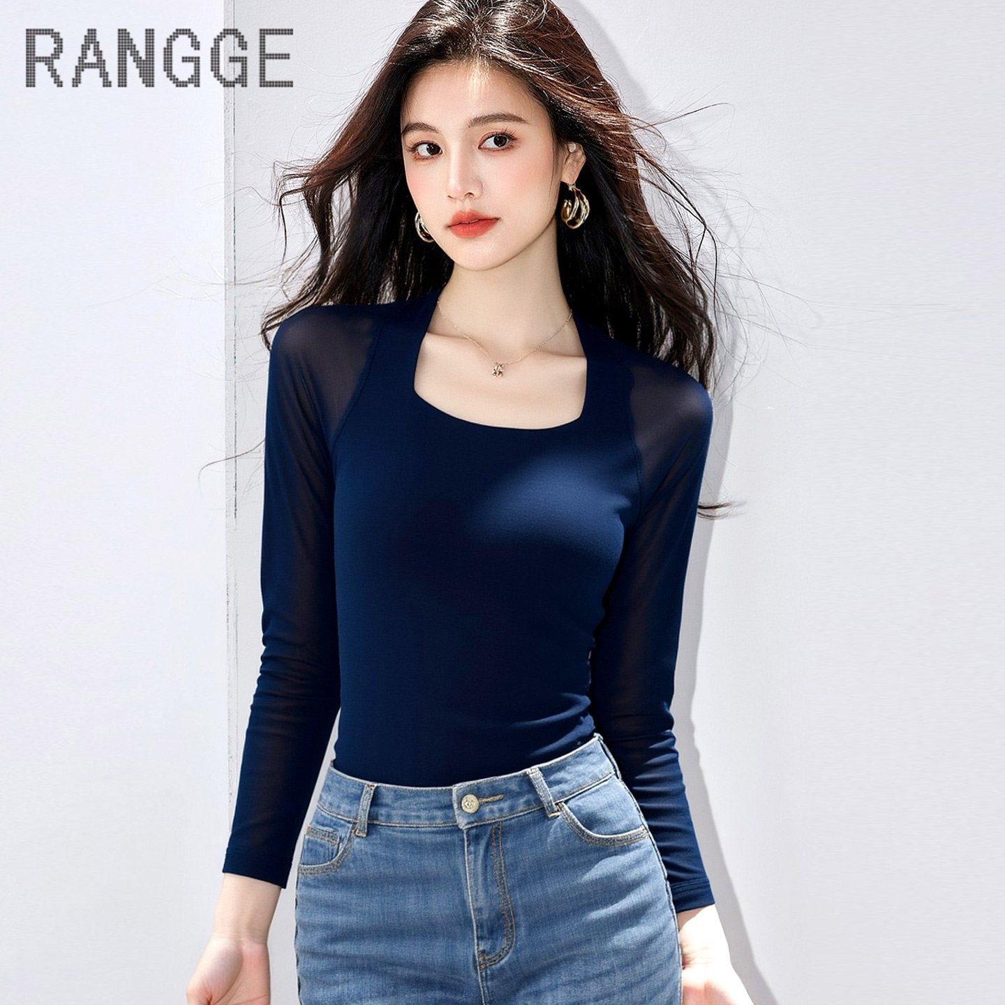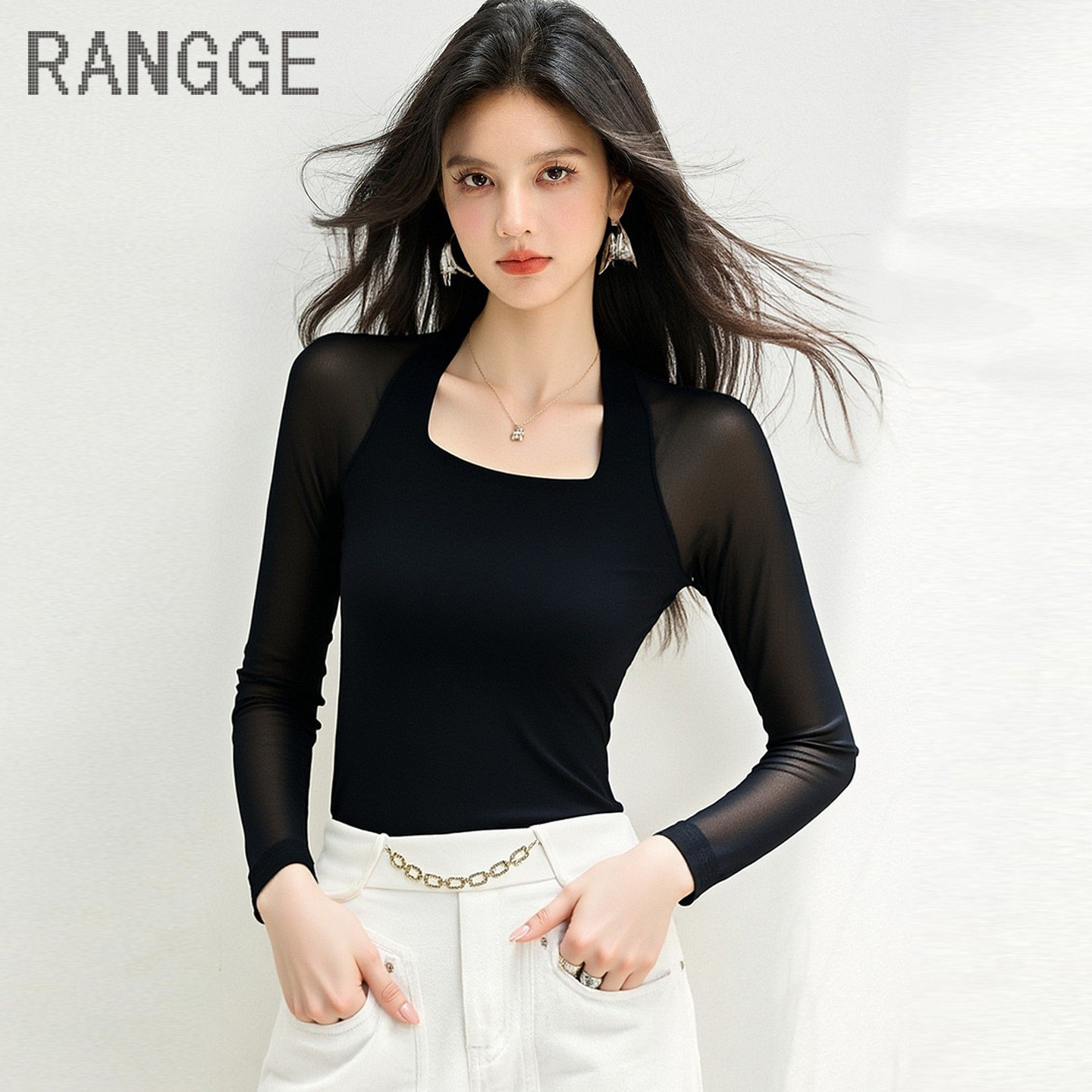 首页> 女装> 优雅方领长袖T恤女薄款网纱打底衫洋气设计感弹力舞蹈上衣瑜伽服