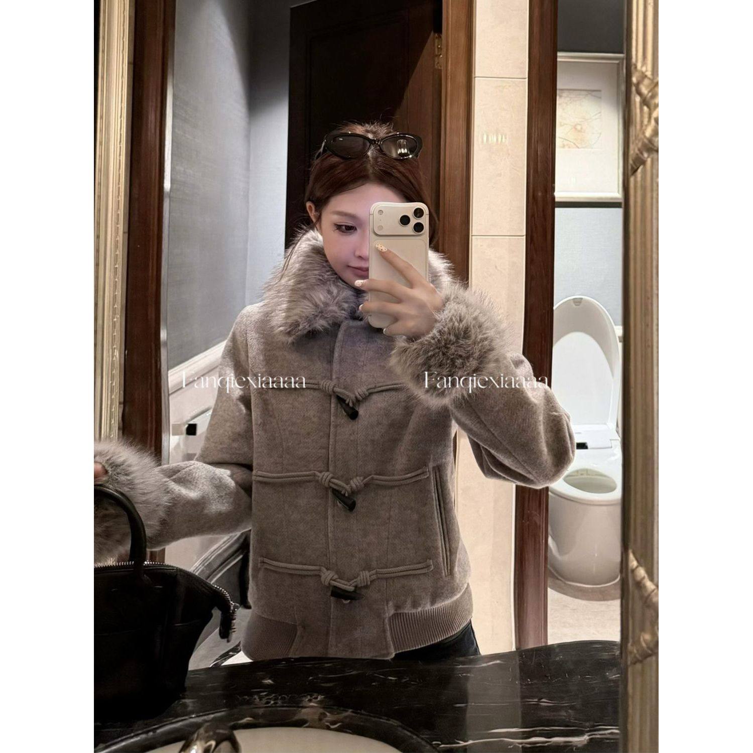 摩登腔调 设计感牛角扣可脱卸毛领夹棉毛呢外套女冬新款百搭上衣