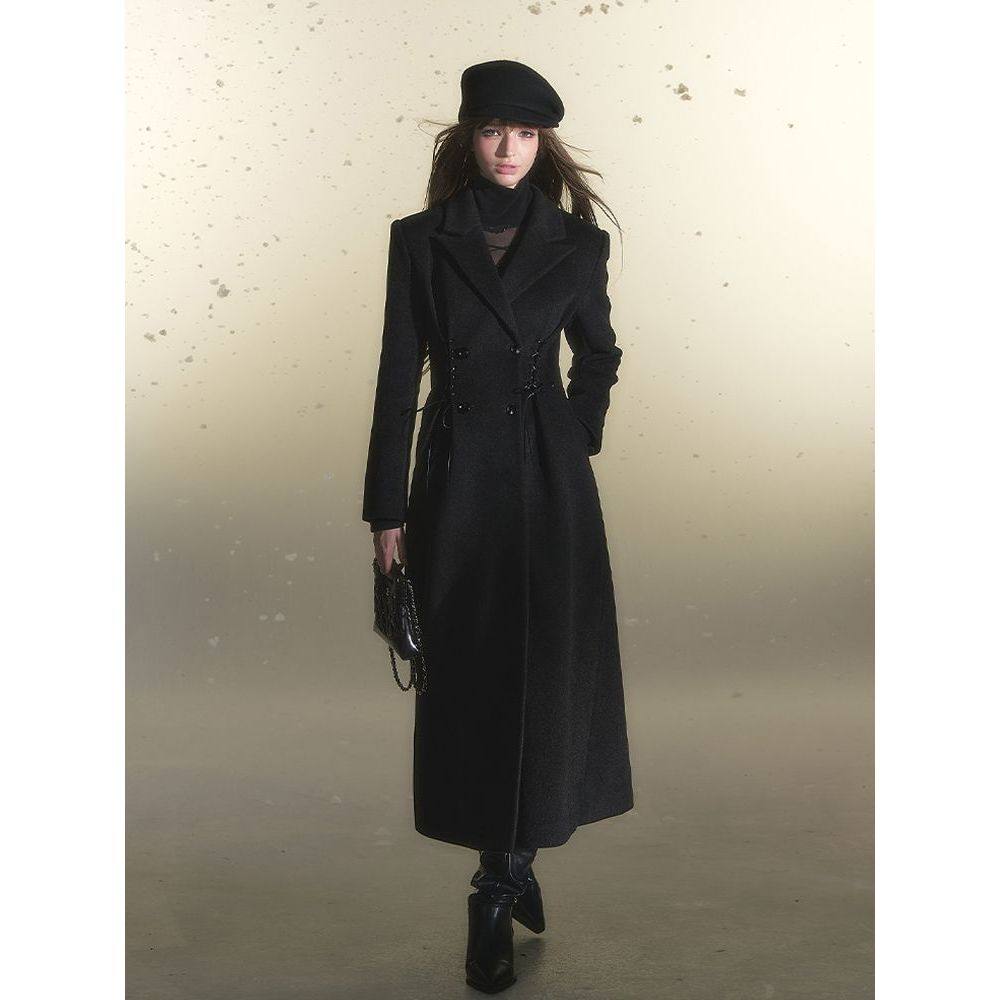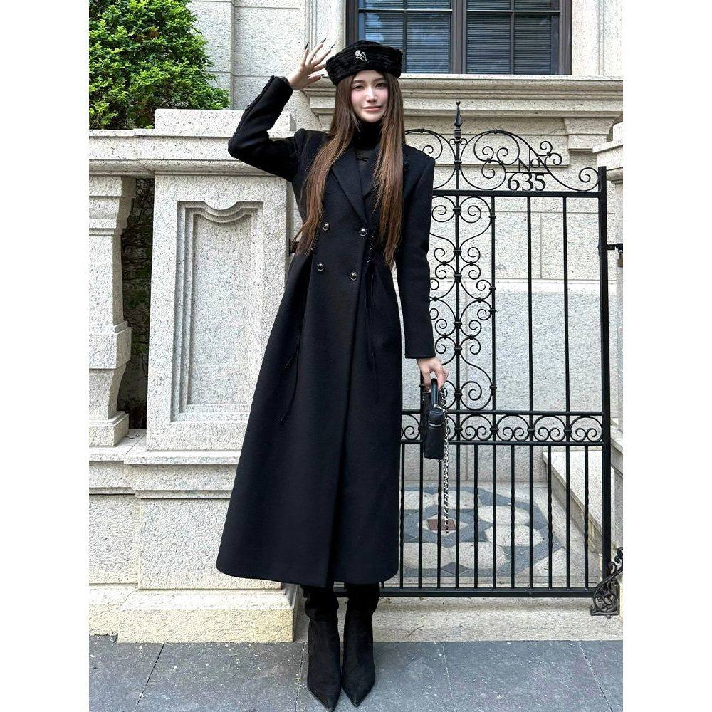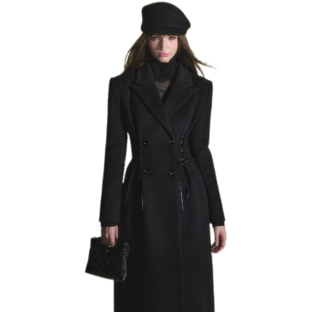 巴黎香颂 气质感留洋大小姐超模收腰绑带双排扣长款毛呢大衣外套