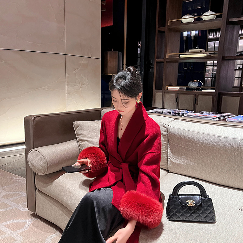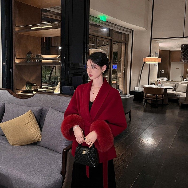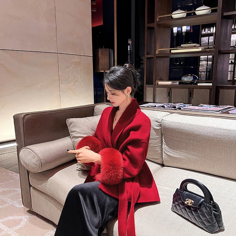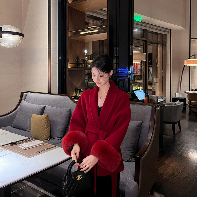 红色双面羊绒大衣女2025新款秋冬高端气质袖口狐狸毛结婚毛呢外套