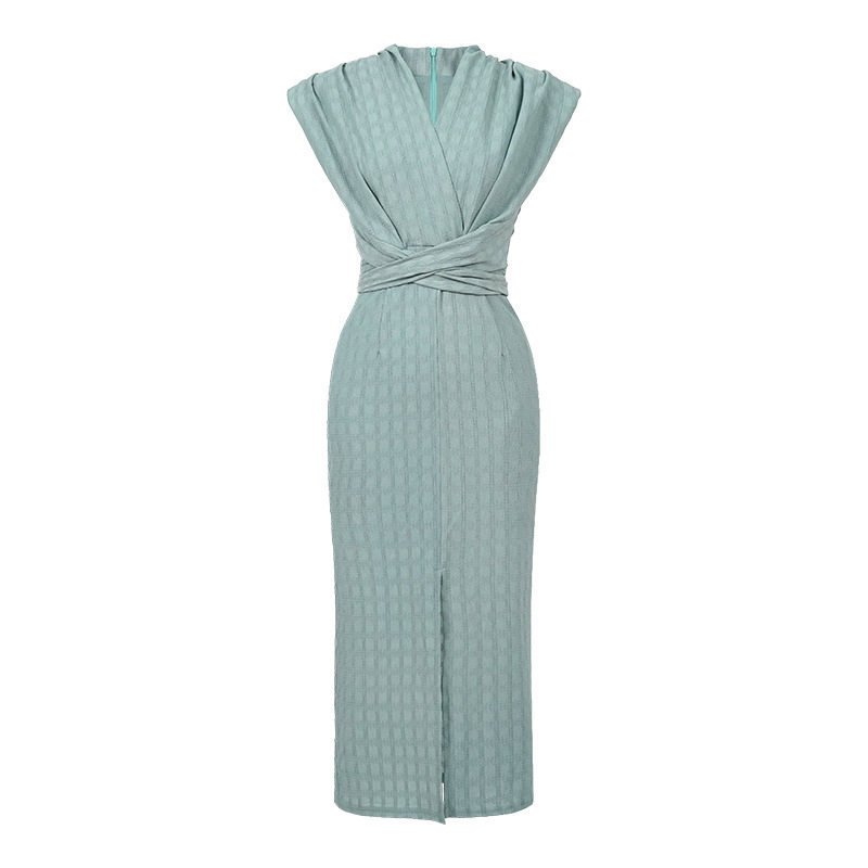 2025夏季新款女法式设计感扭结收腰包臀开叉针织短袖连衣裙30858