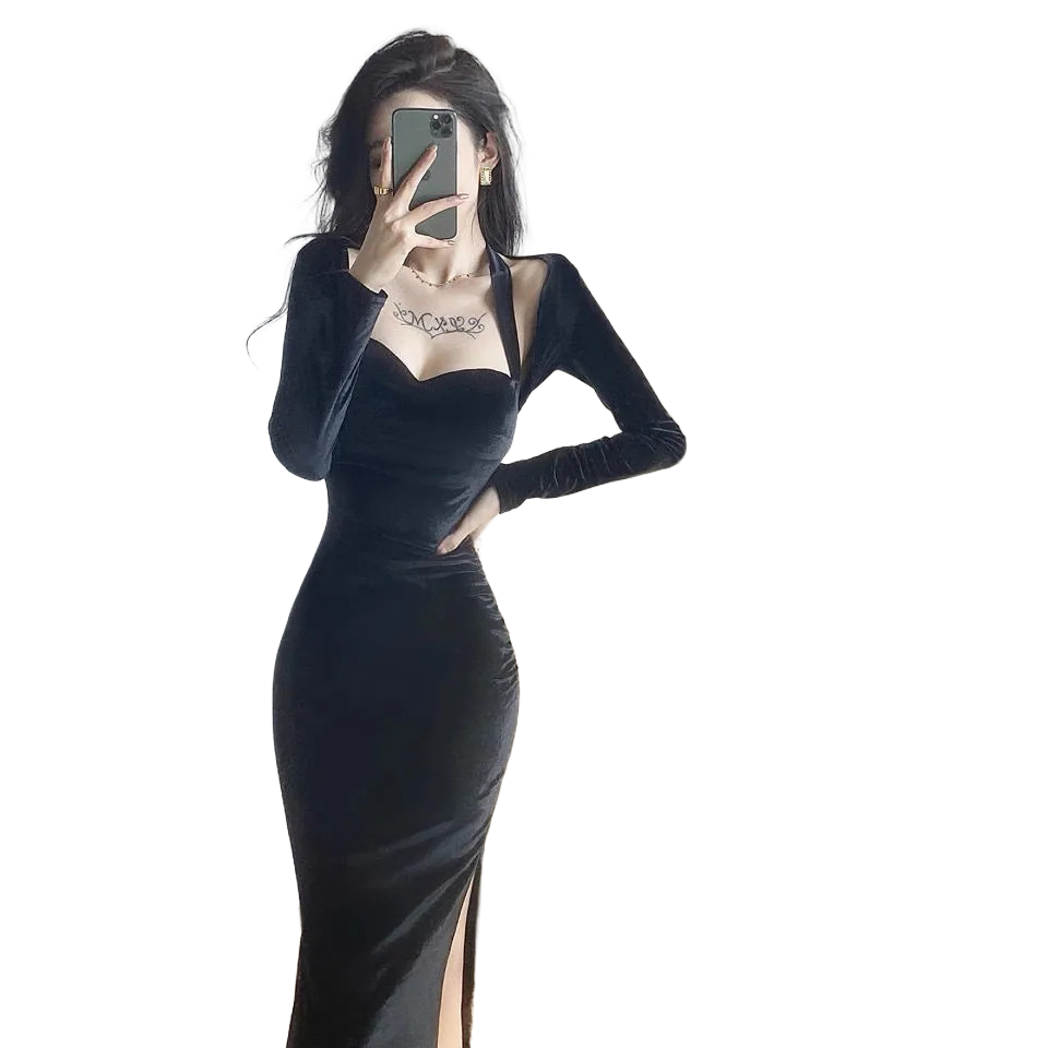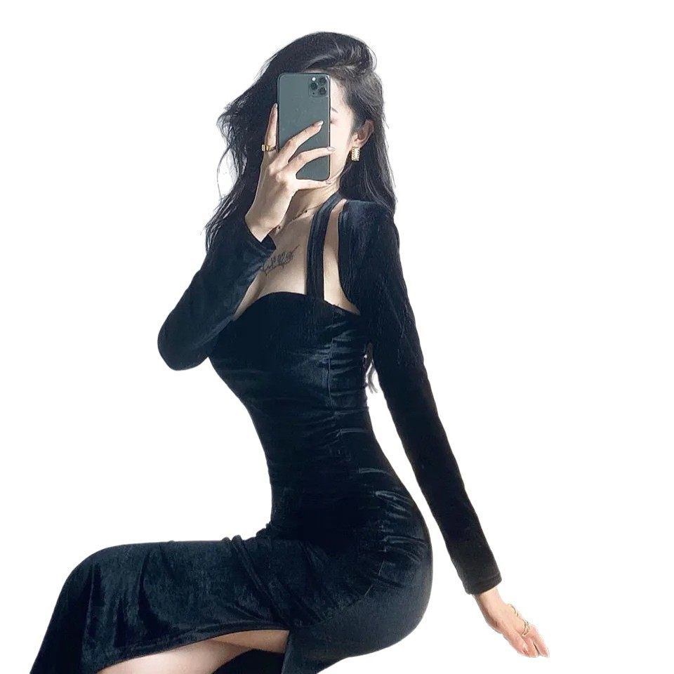 名媛女人味绒御姐范性感显身材连衣裙挂脖抹胸包臀长裙子套装