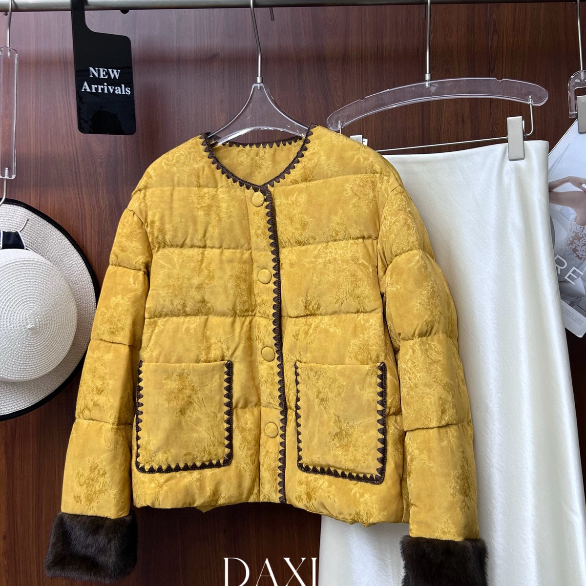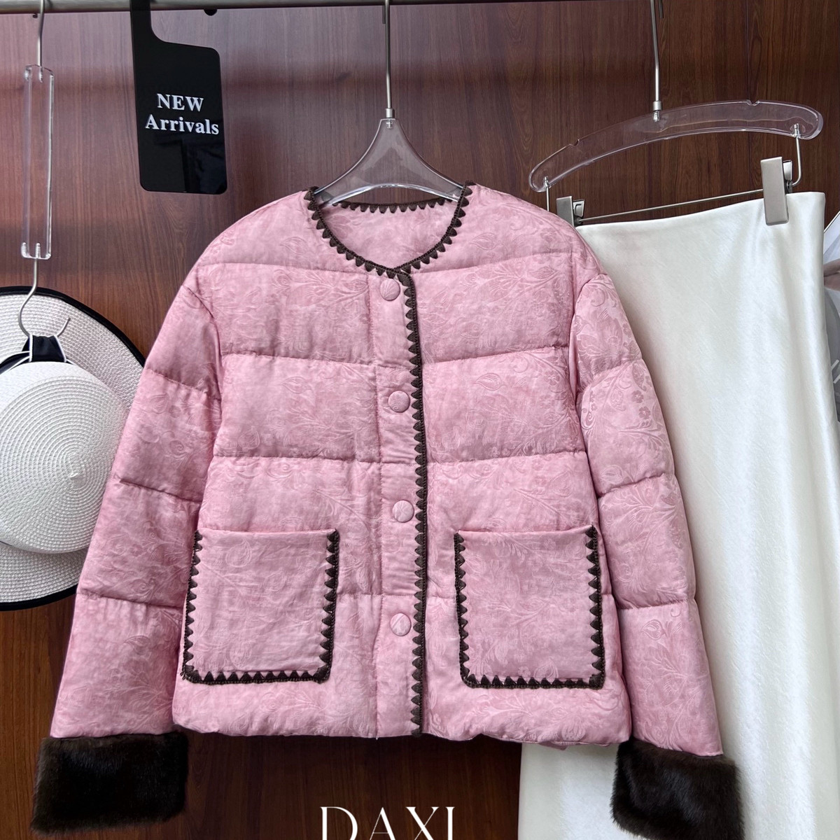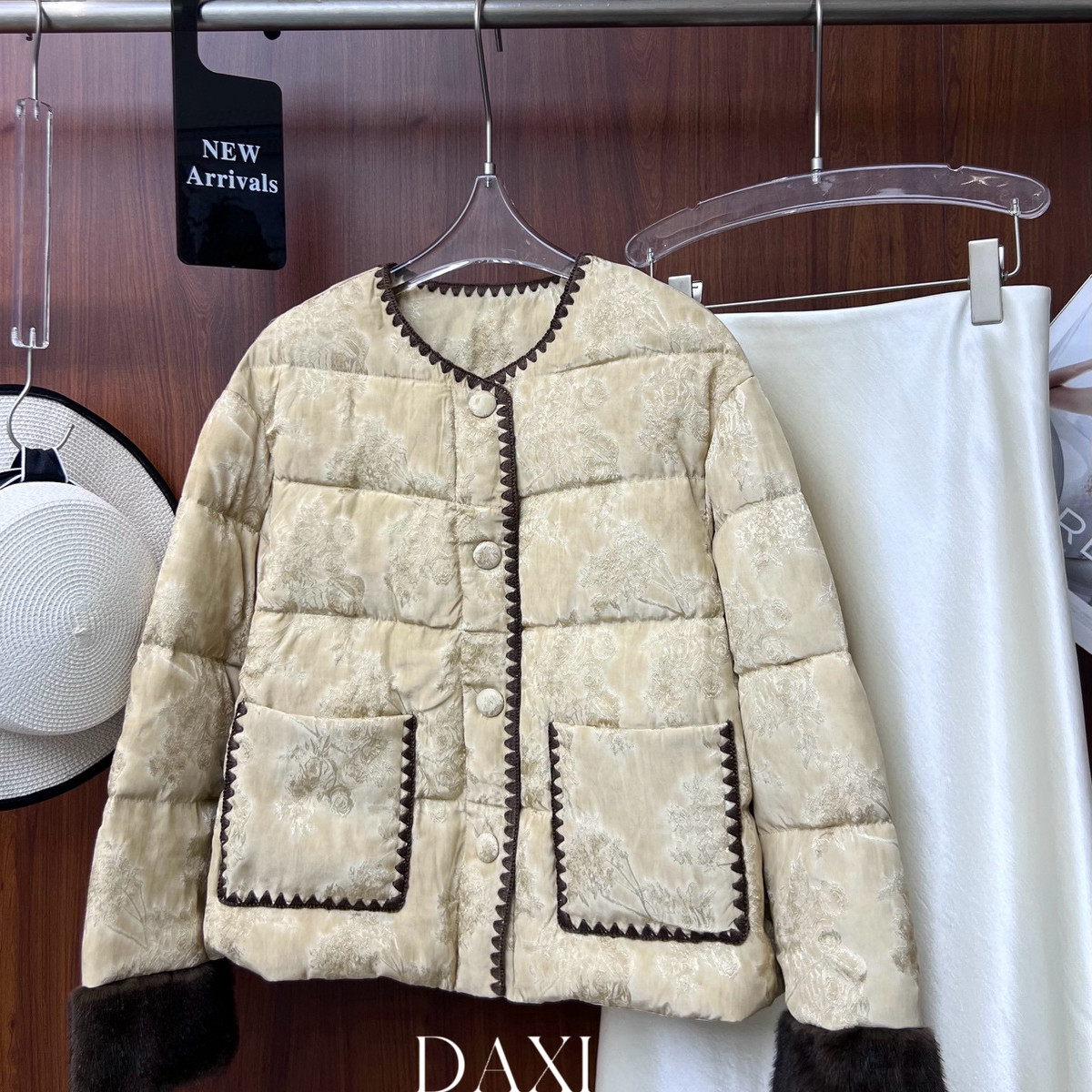 冬上新!优雅气质提花毛袖保暖羽绒服外套(仿毛不可拆)