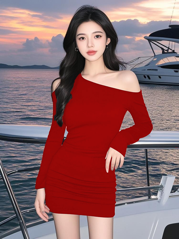 不规则斜领露肩黑色连衣裙女秋季长袖紧身辣妹性感修身显瘦包臀裙