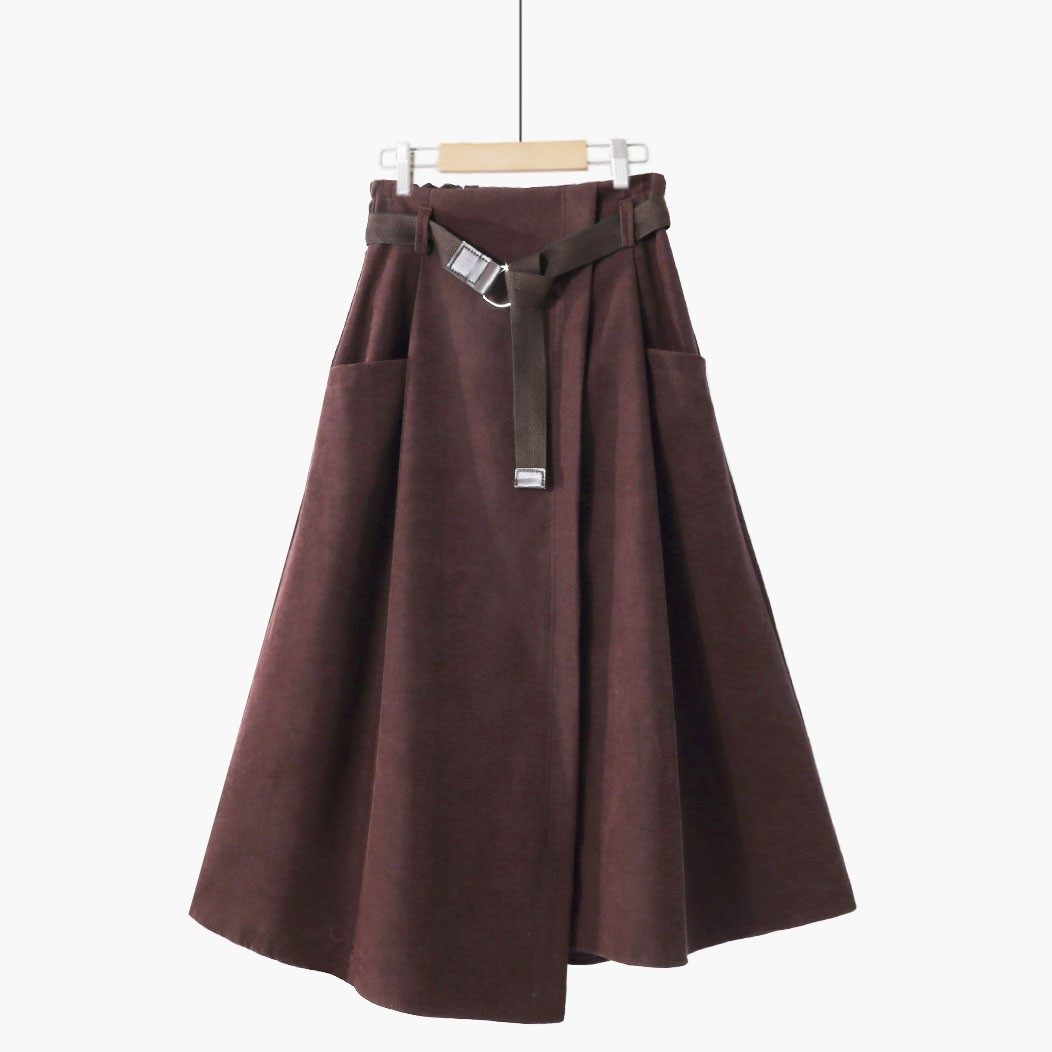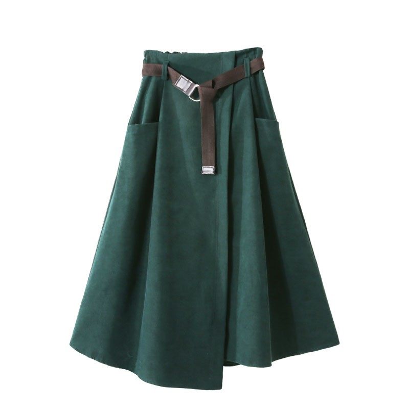 秋冬韩版简约纯色腰带条绒口袋不规则工装裙显瘦a字裙半身裙子