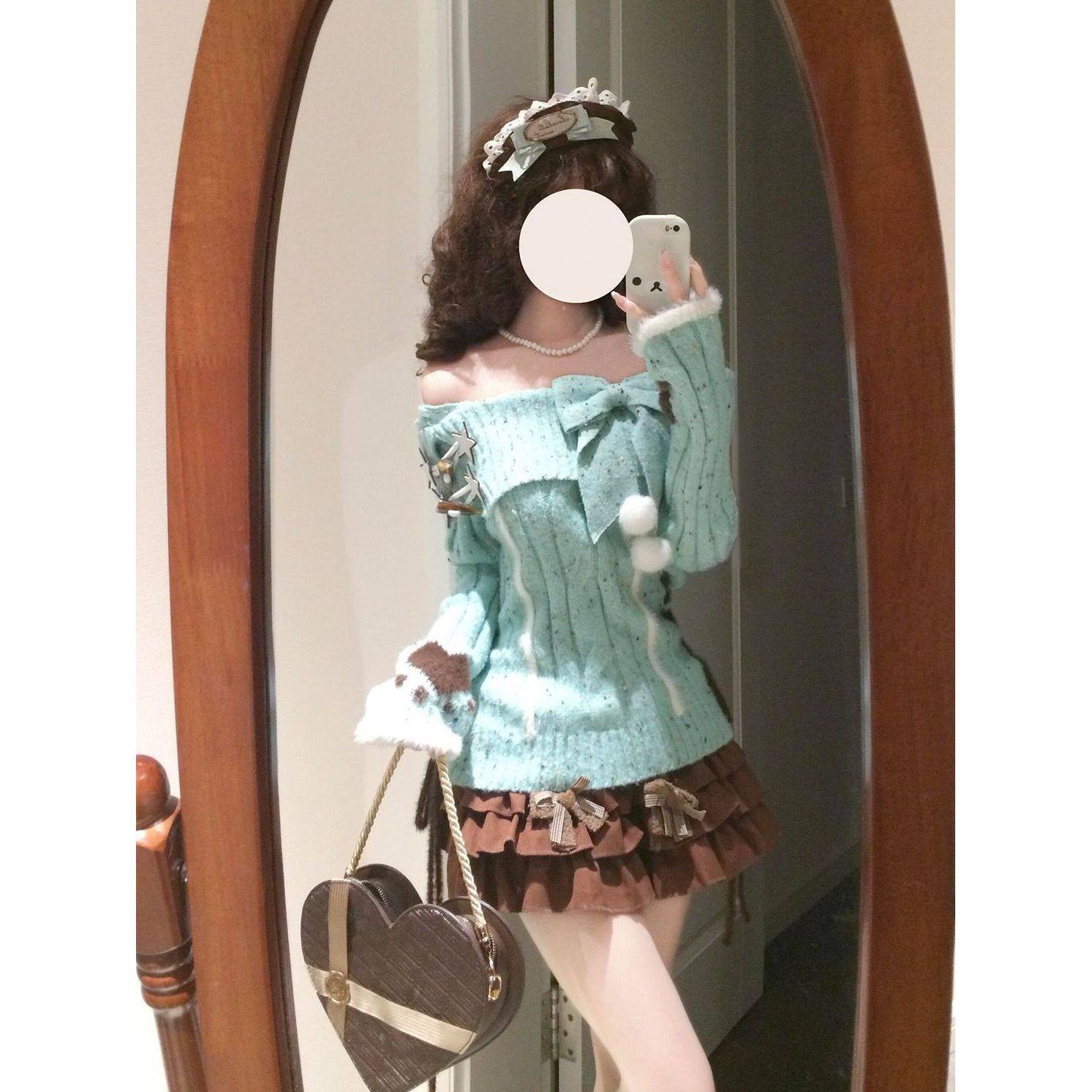 薄荷巧克力 甜美可爱立体一字露肩针织毛衣+咖色蛋糕半裙两件套女