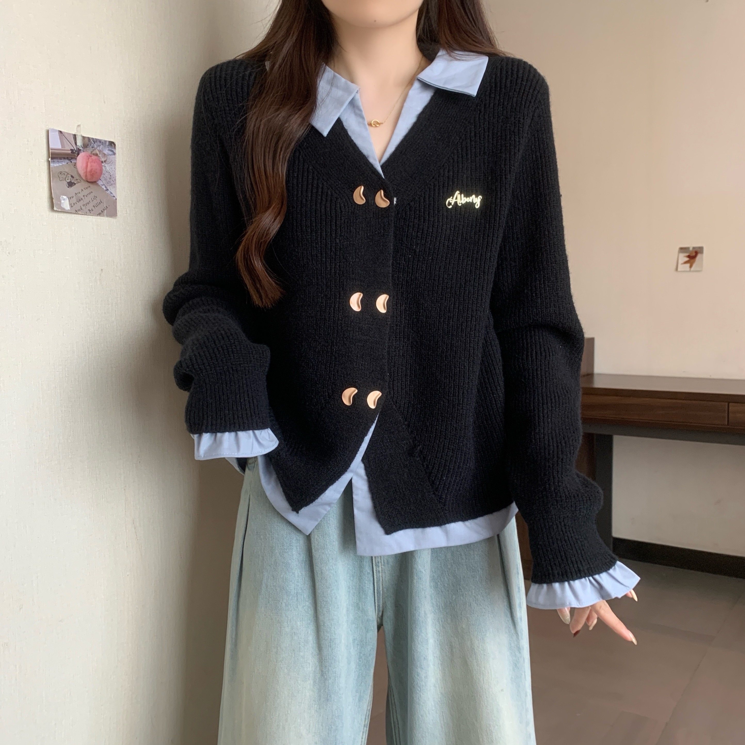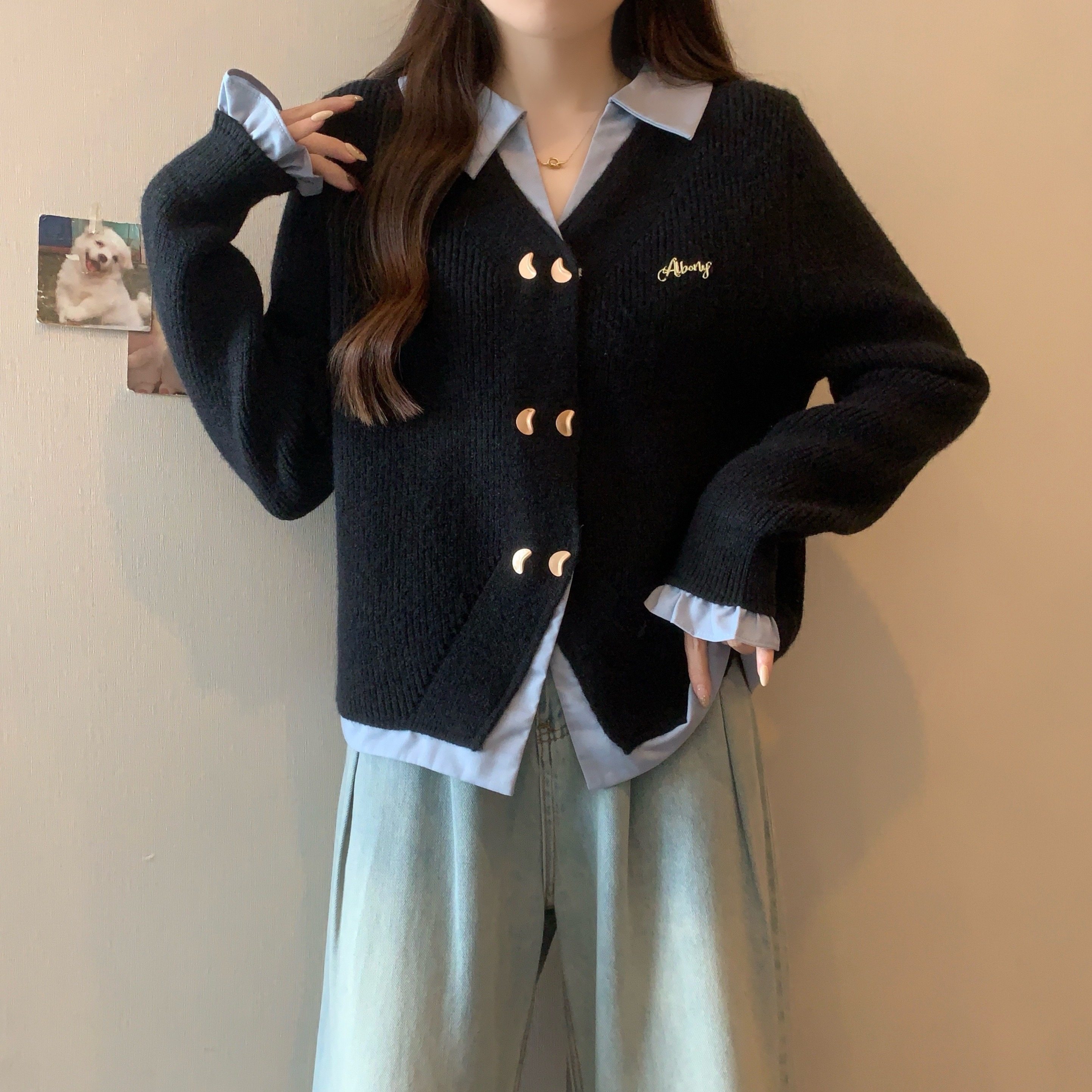 实拍~大码秋冬新款polo领假两件针织衫胖mm宽松刺绣开衫毛衣外套