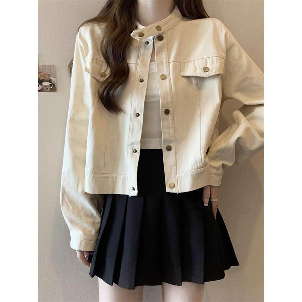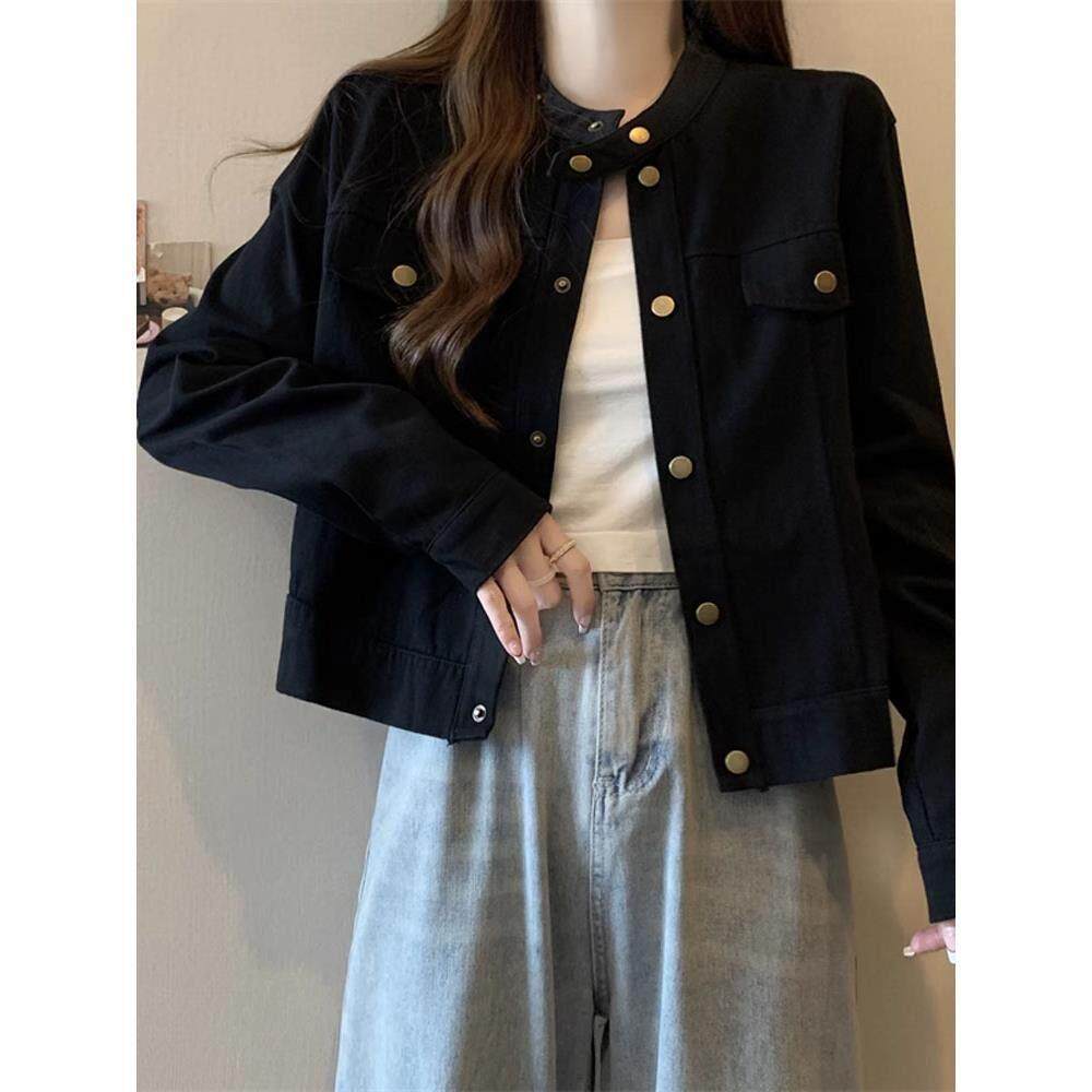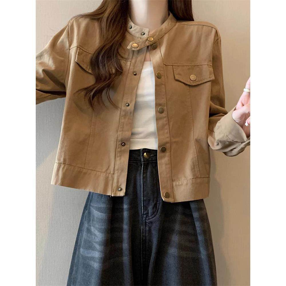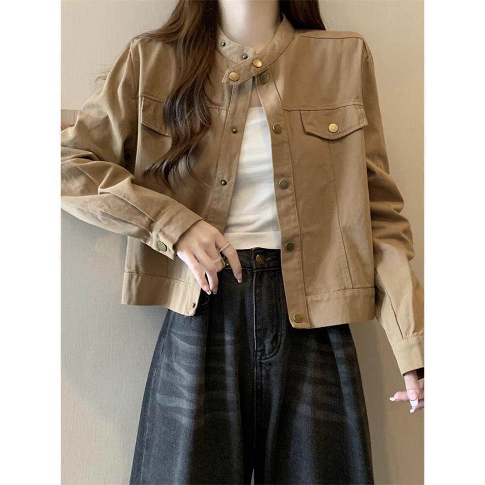韩国大码胖mm美式立领夹克外套女春秋2025新款工装风正肩短款上衣