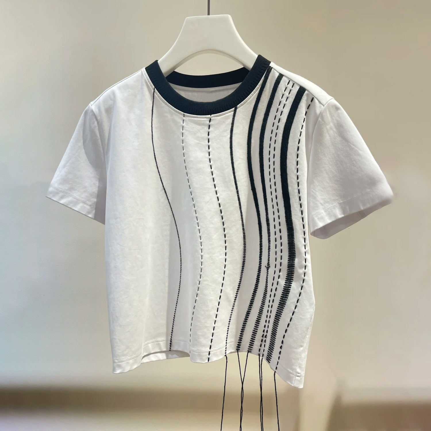 深圳南油高端女装2026春季新款休闲风条纹圆领设计宽松白色短袖女