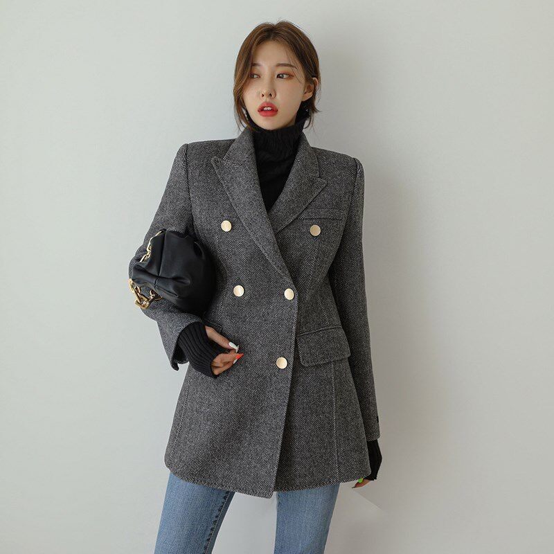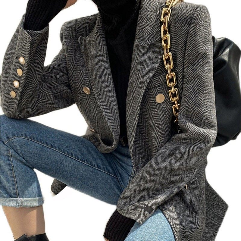 日本代购高级感人字纹毛呢外套女春秋中长款修身金扣呢子西装上衣