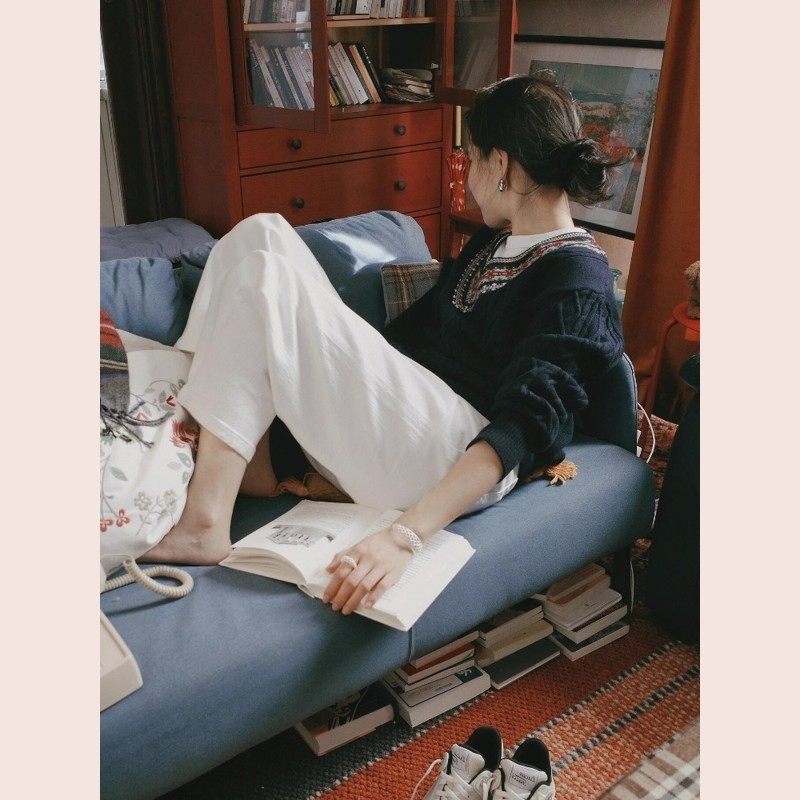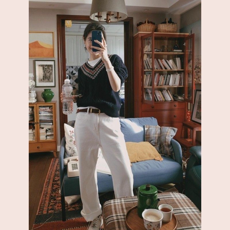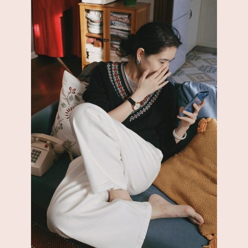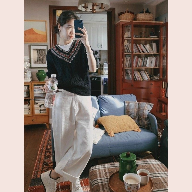费尔岛藏青色V领提花毛衣氛围感高级慵懒复古日系针织衫2025秋季