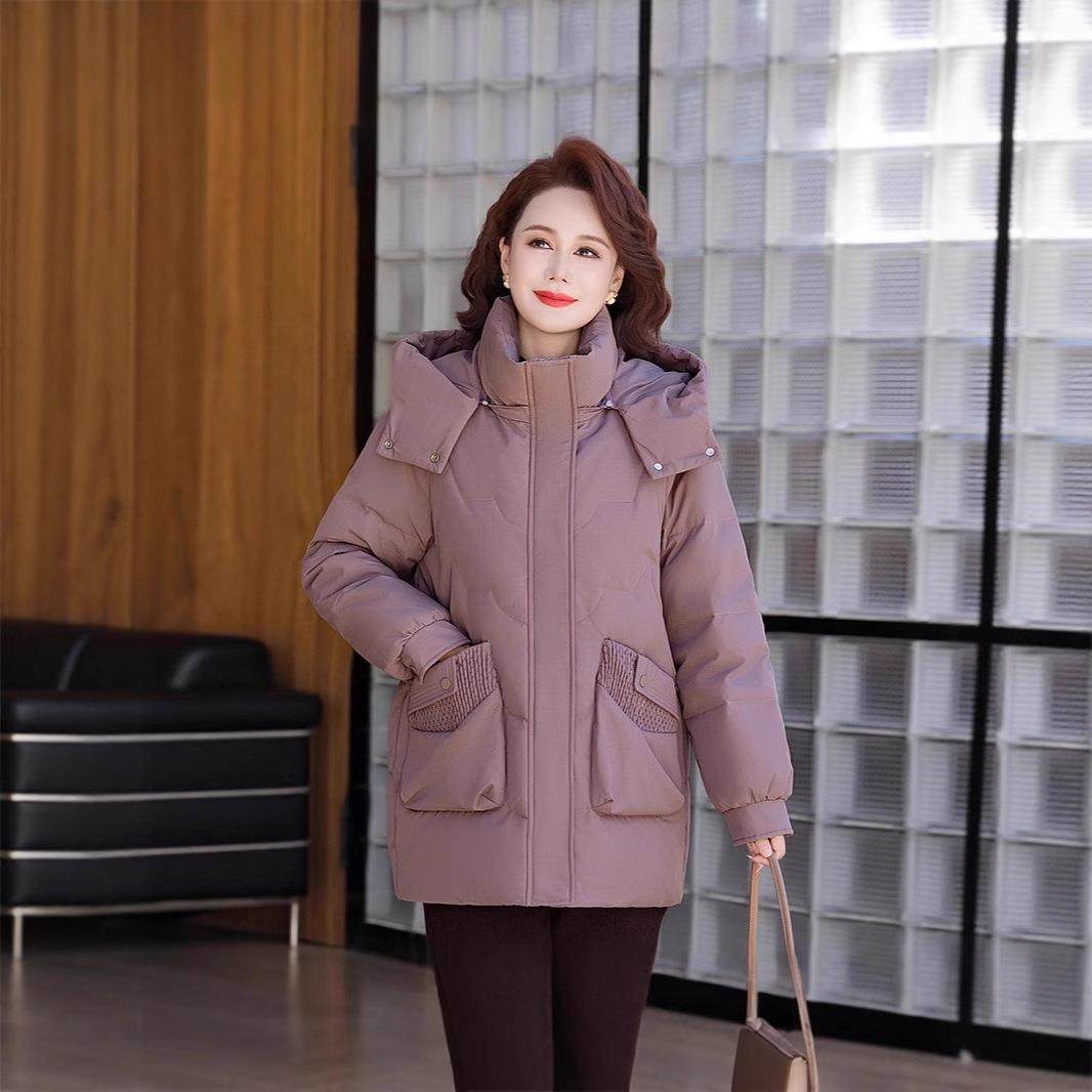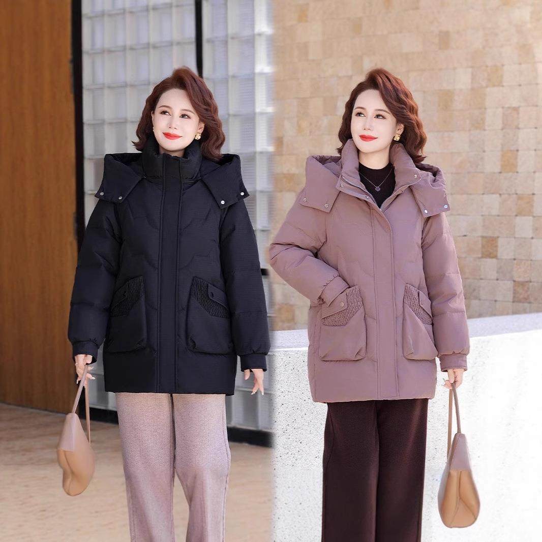 中年妈防妈羽绒女冬装服中长款加厚老856年人女休闲连帽中保暖外