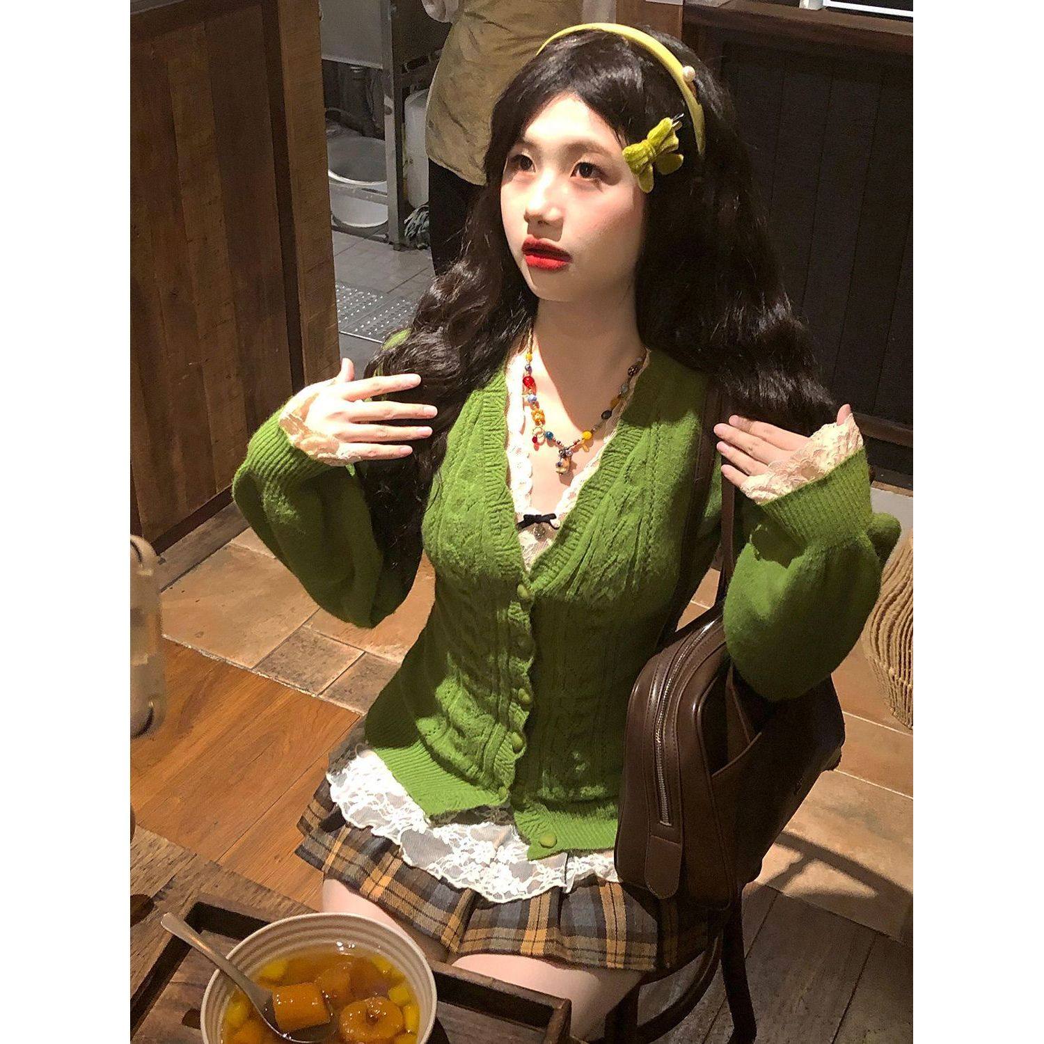 森野百利甜 明亮感叠穿v领爱心扣加厚外套+蕾丝内搭+百褶裙套装
