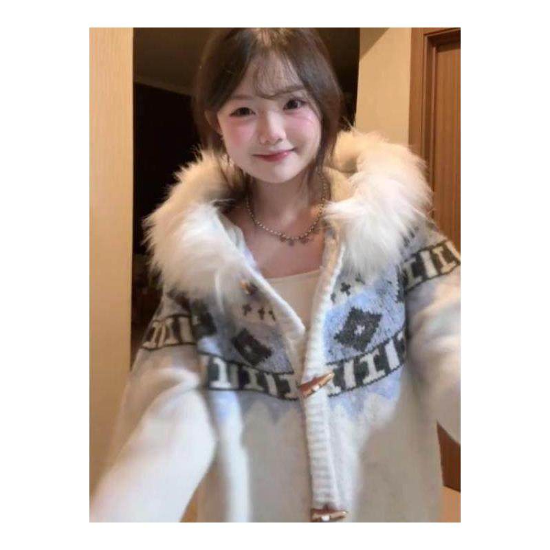 费尔岛牛角扣毛领连帽毛衣外套女秋冬高级感覆古慵懒宽松针织开衫