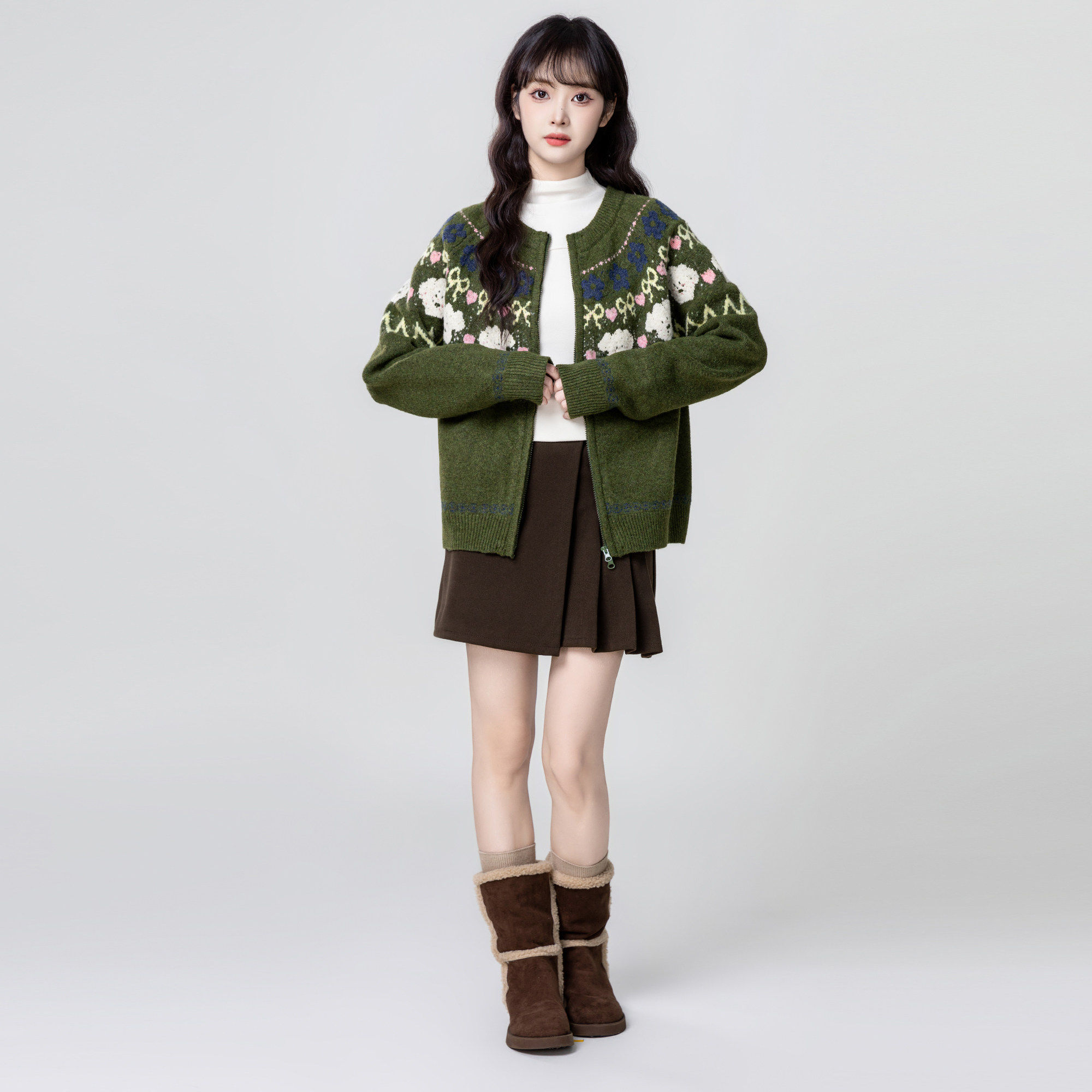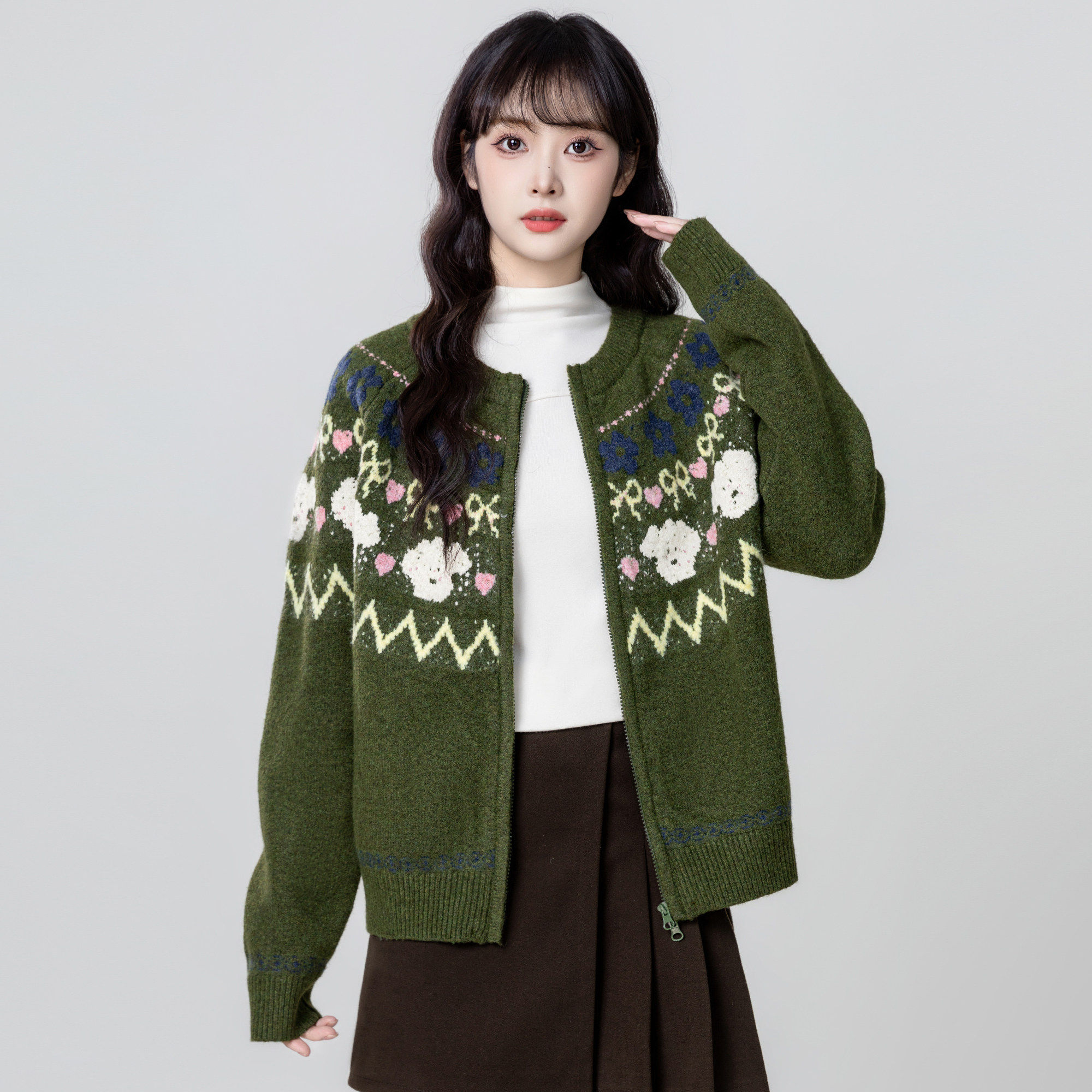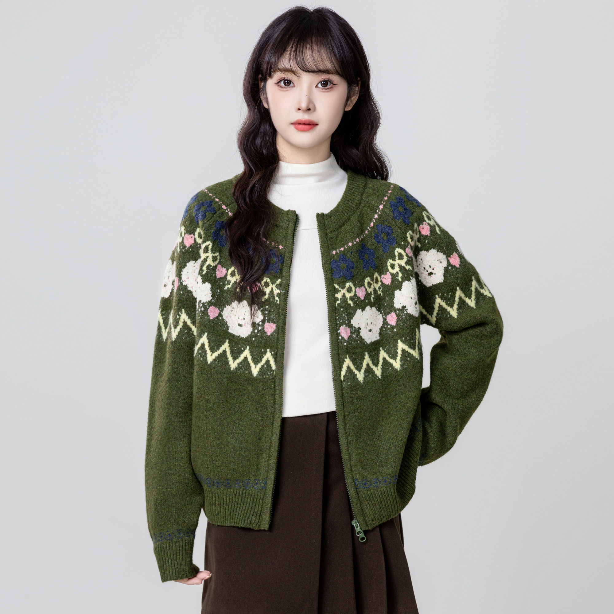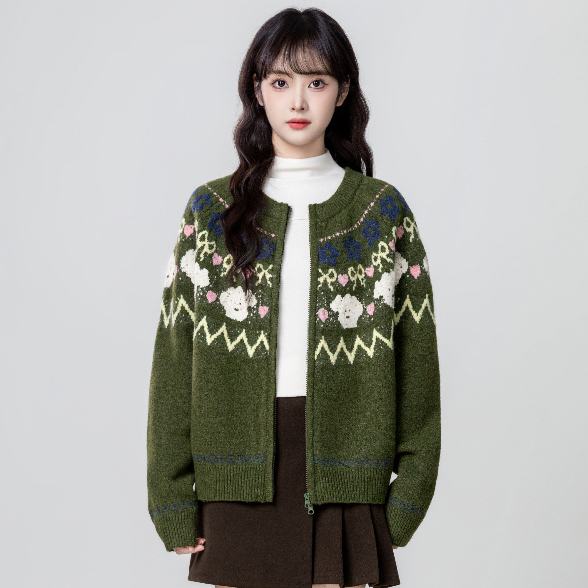 绿色费尔岛毛衣外套女秋冬2025秋季新款加厚提花拉链针织开衫上衣