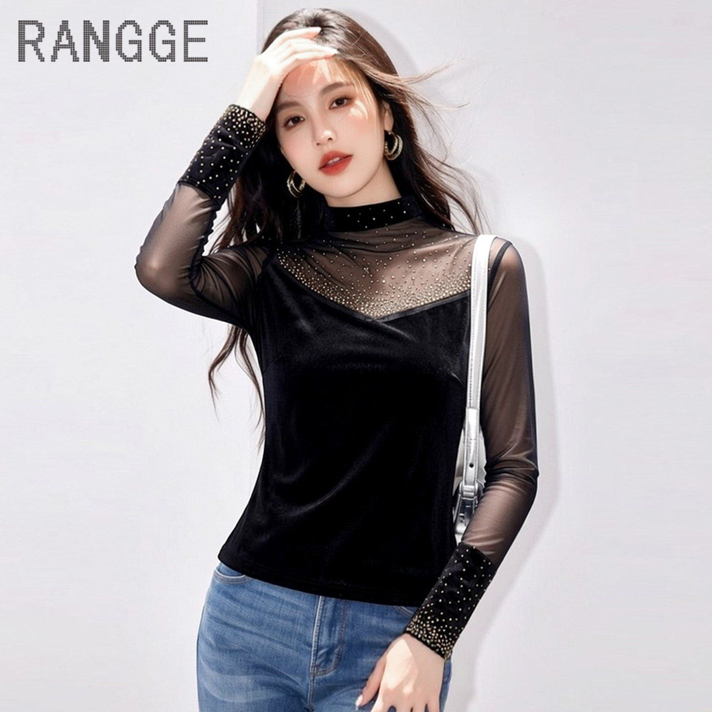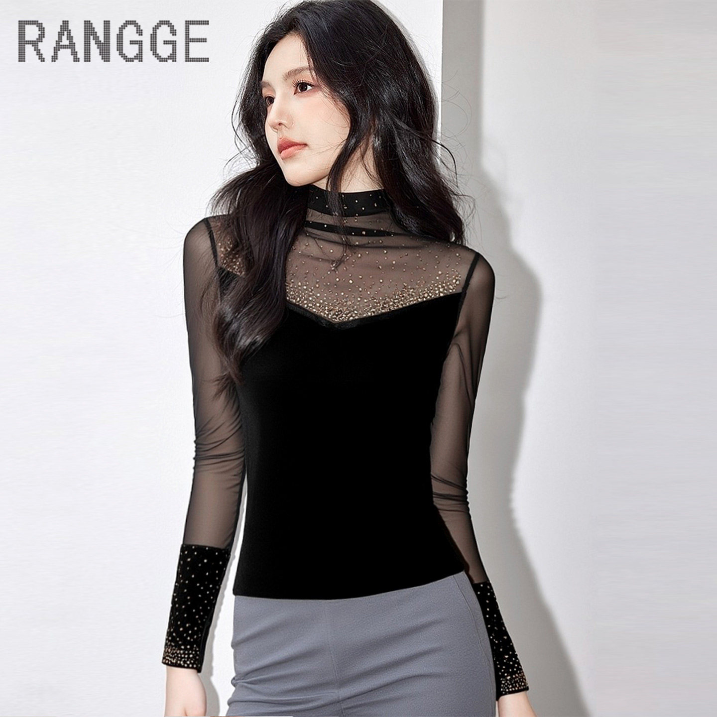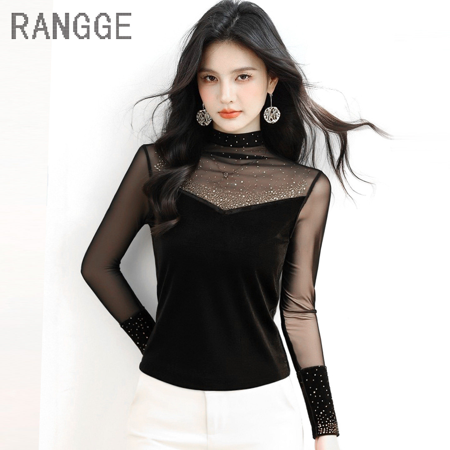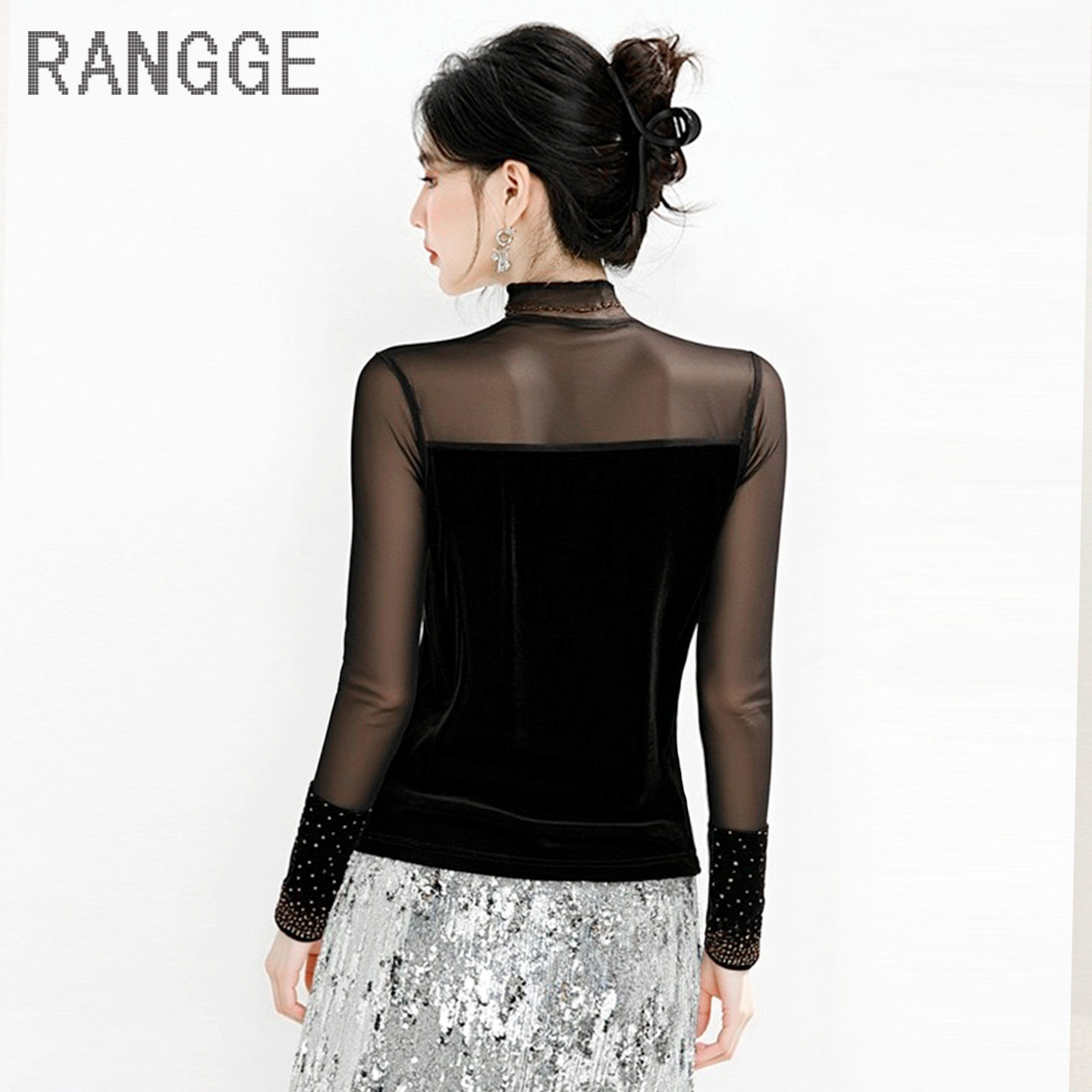 首页> 女装> 黑色丝绒上衣半高领网纱长袖T恤女烫钻蕾丝拼接透视打底衫高级感