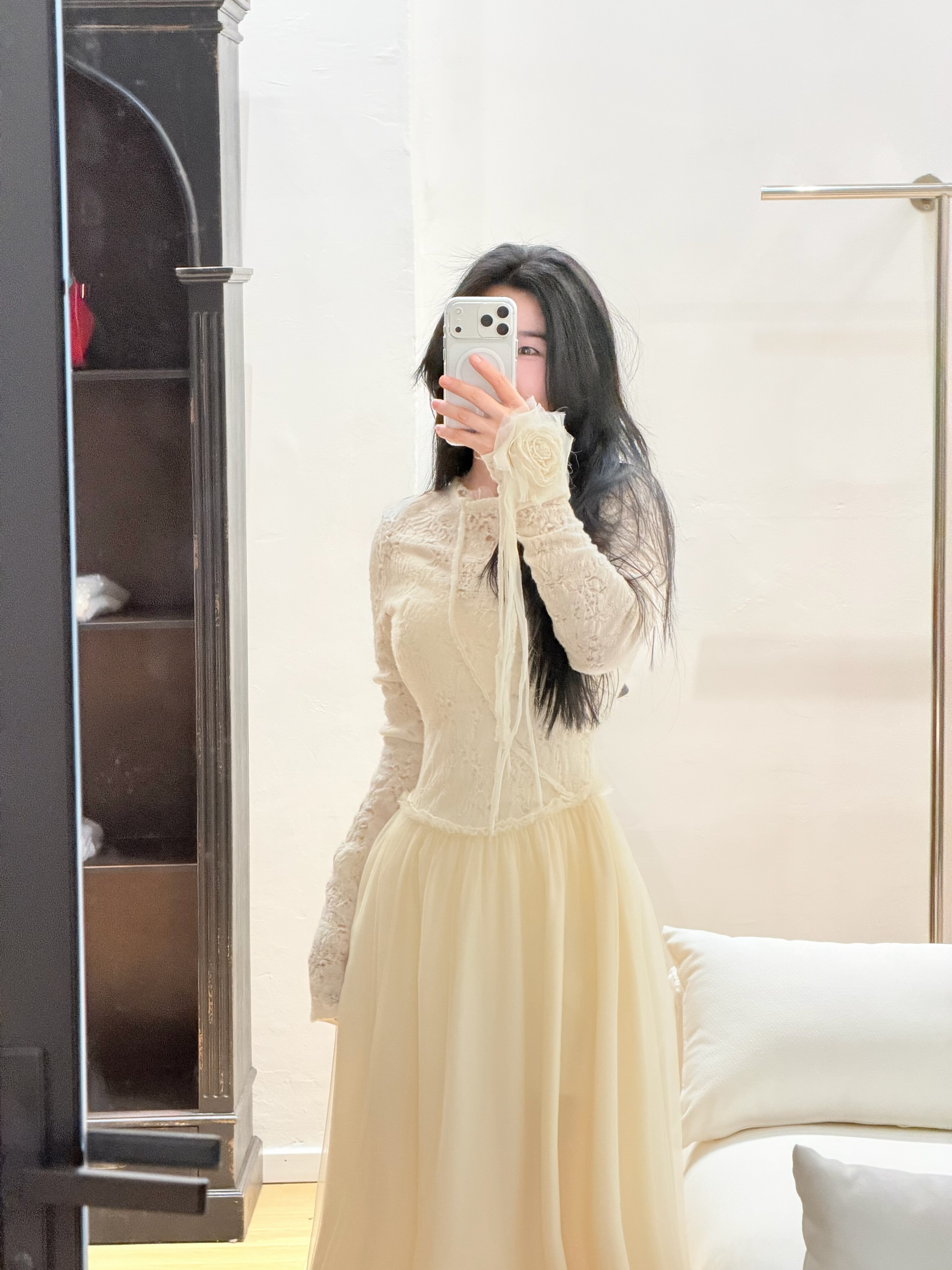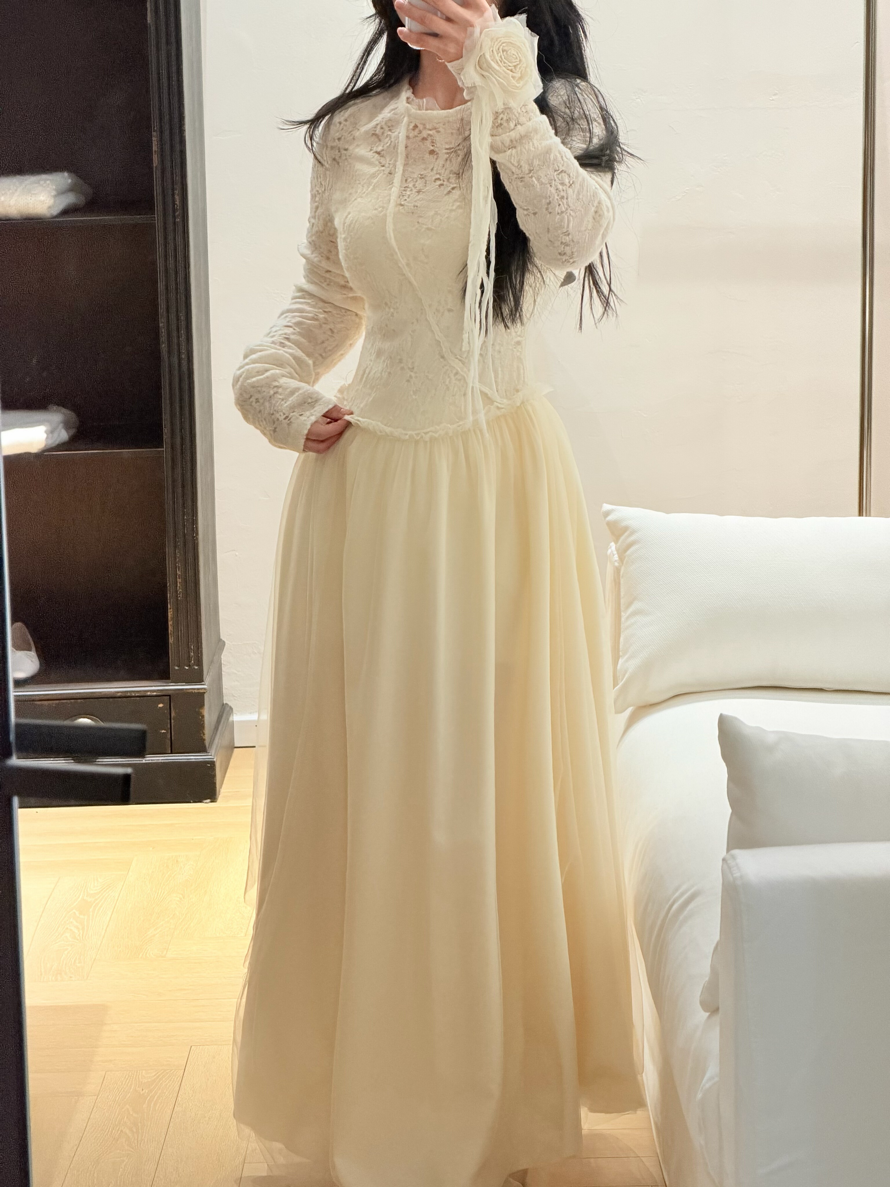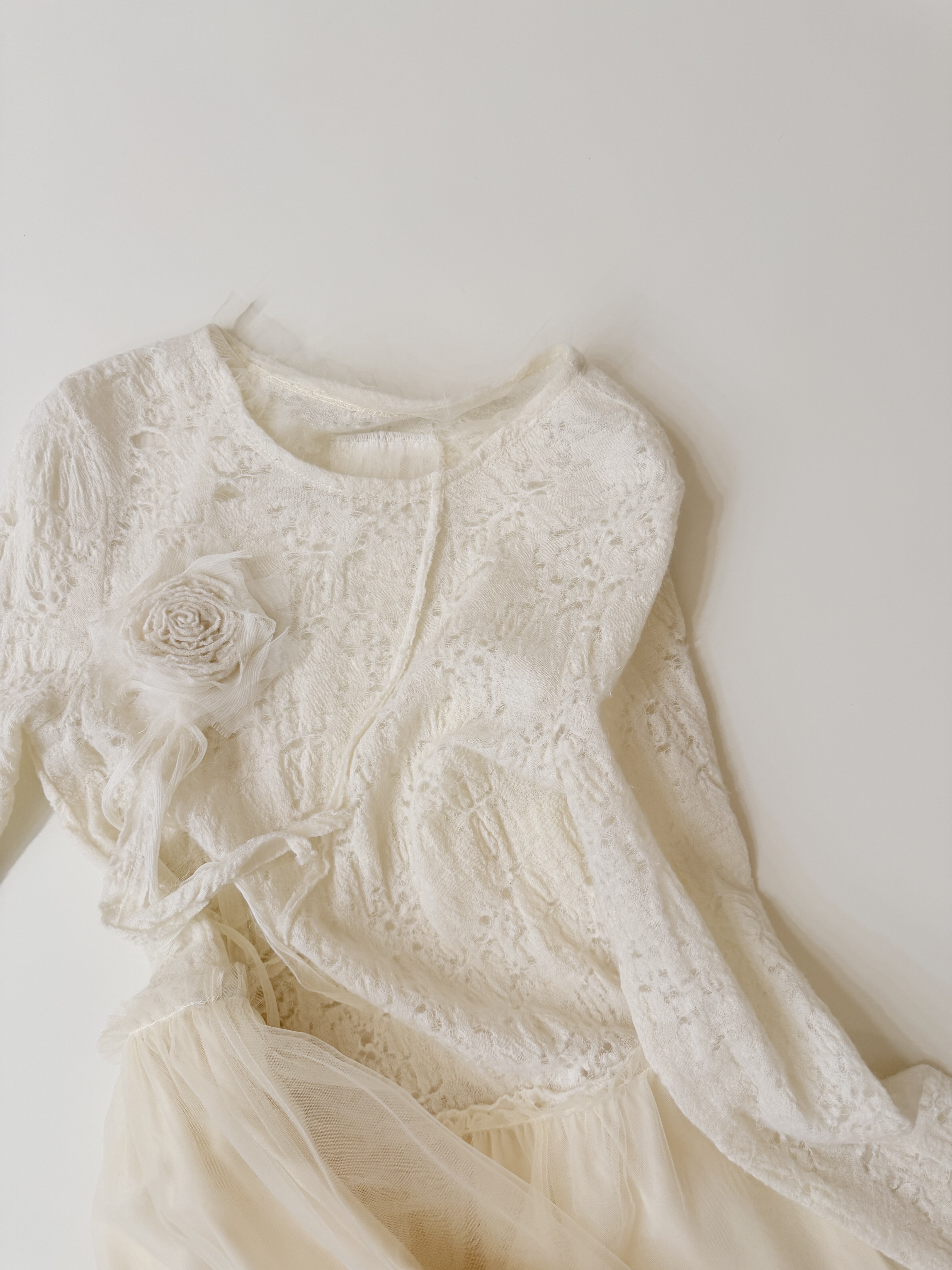 Tèbianco白茶•设计师款仙女手工花朵网纱拼接羊毛提花连衣裙