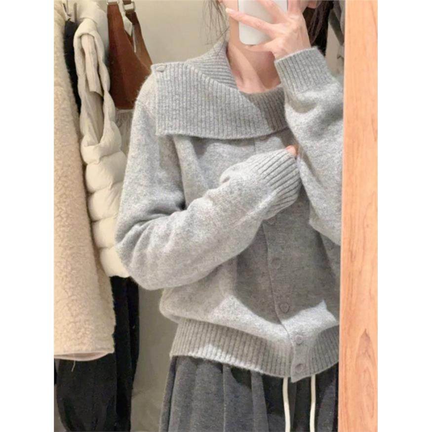 设计感独特灰色翻领羊毛针织衫女早秋chic别致不规则短款开衫上衣