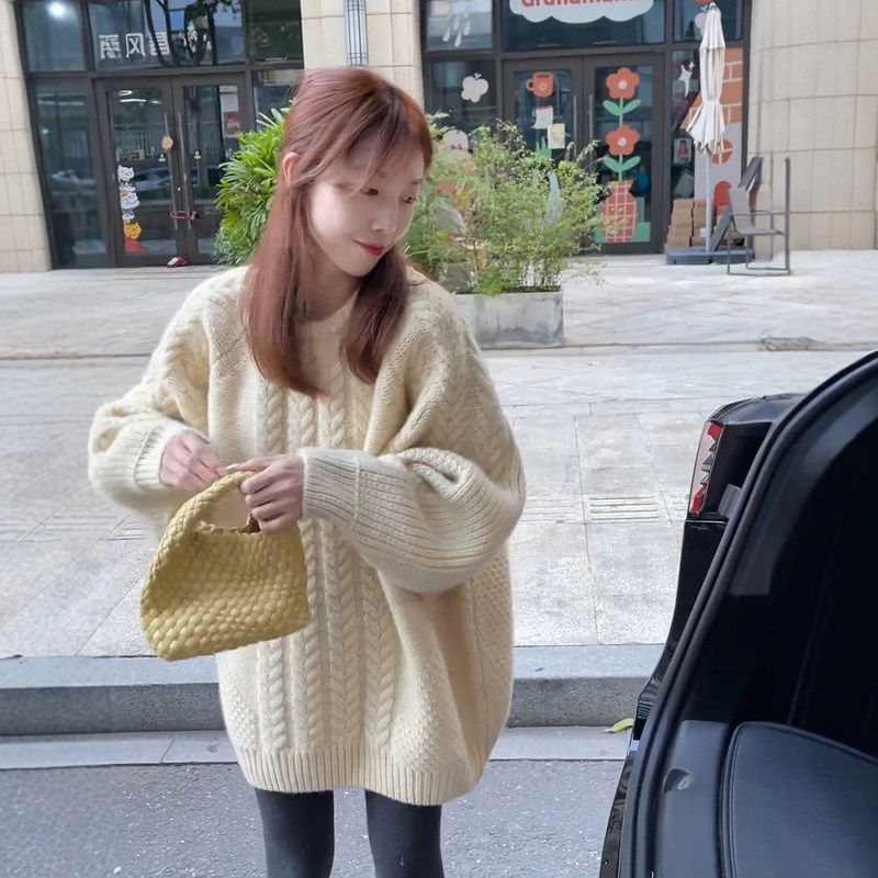 黄色中长版麻花圆领毛衣女秋冬慵懒风宽松软糯针织衫下装消失上衣