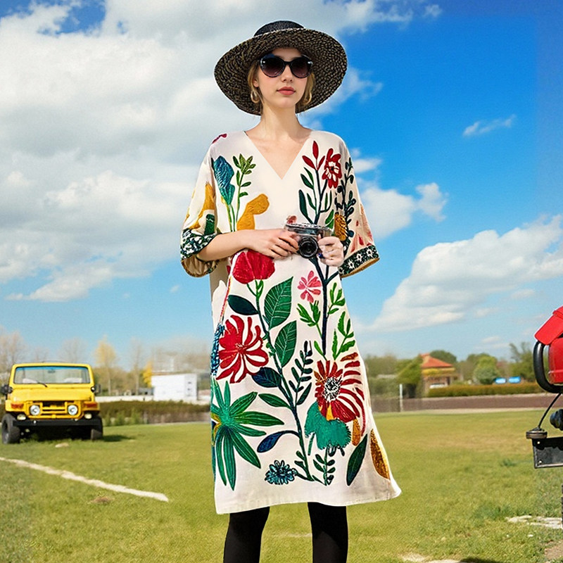 希腊风复古大码沙滩裙宽松印花连衣裙女V领手绘显瘦中长款度假裙