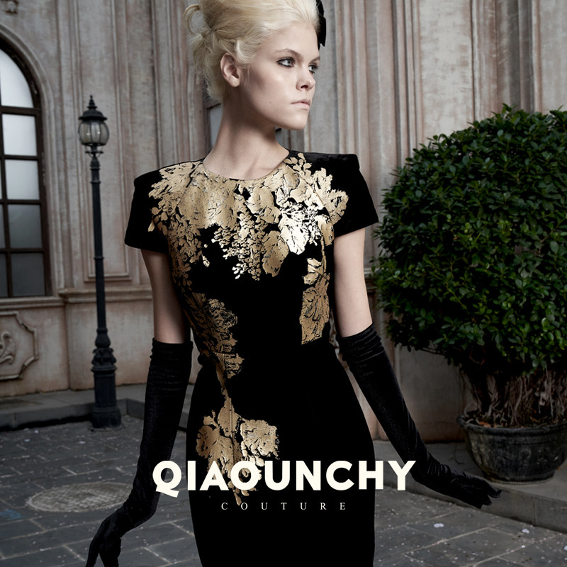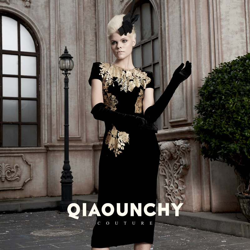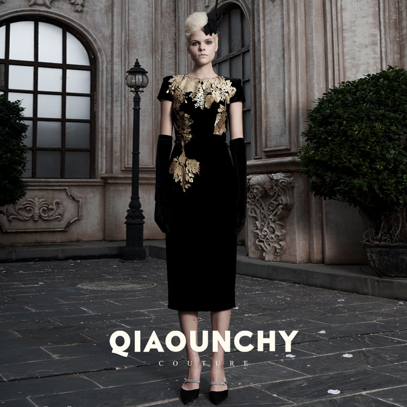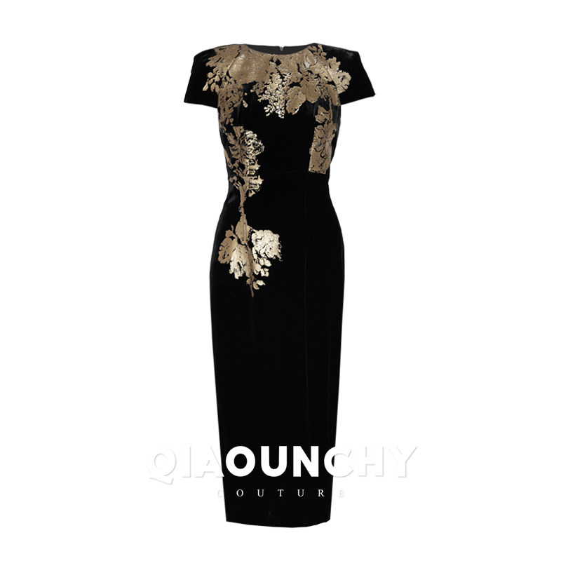 黑金 QIAOUNCHY俏云曦|牡丹花法式真丝丝绒宽肩收腰连衣裙25秋冬