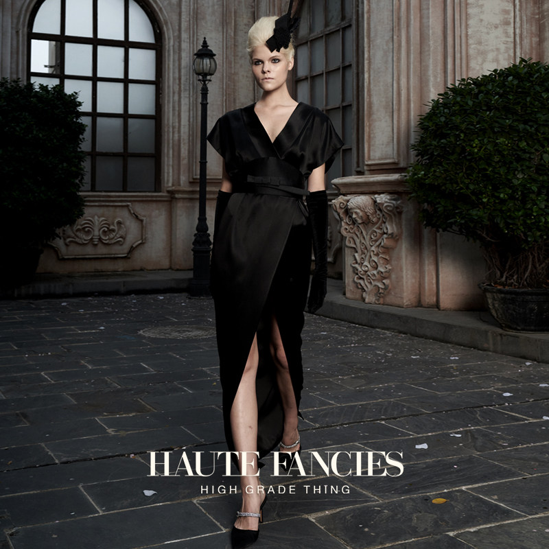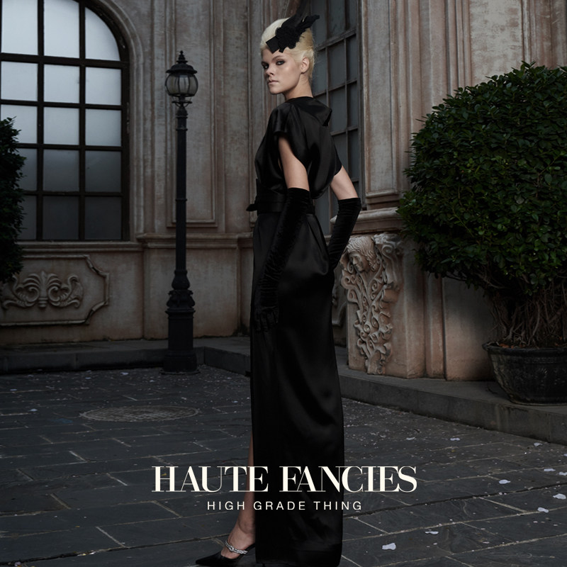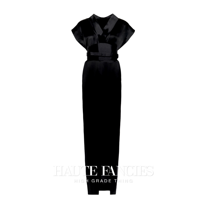 特工风 HAUTE FANCIES后构想 | 黑色高级缎面宽腰封高开衩连衣裙
