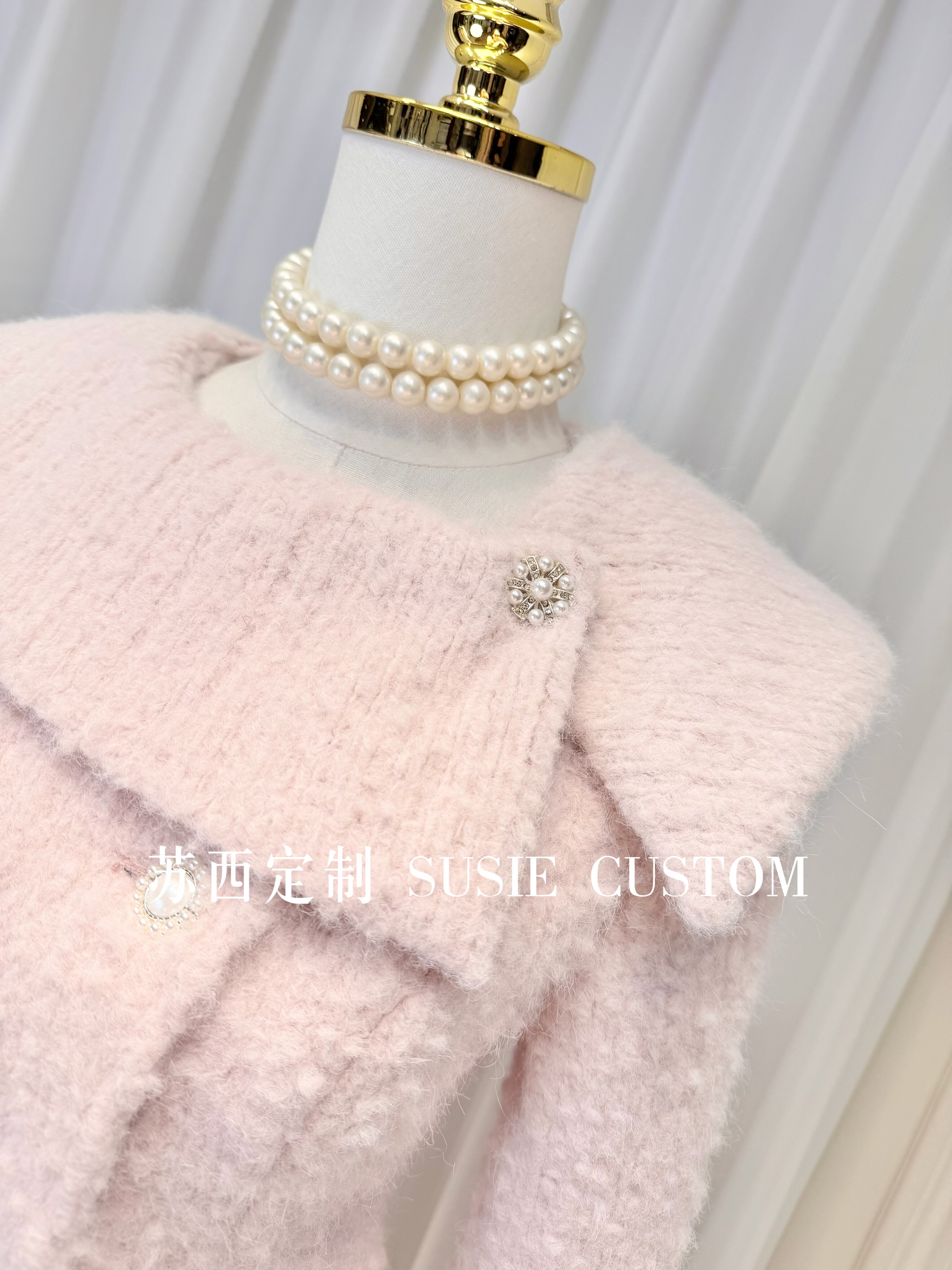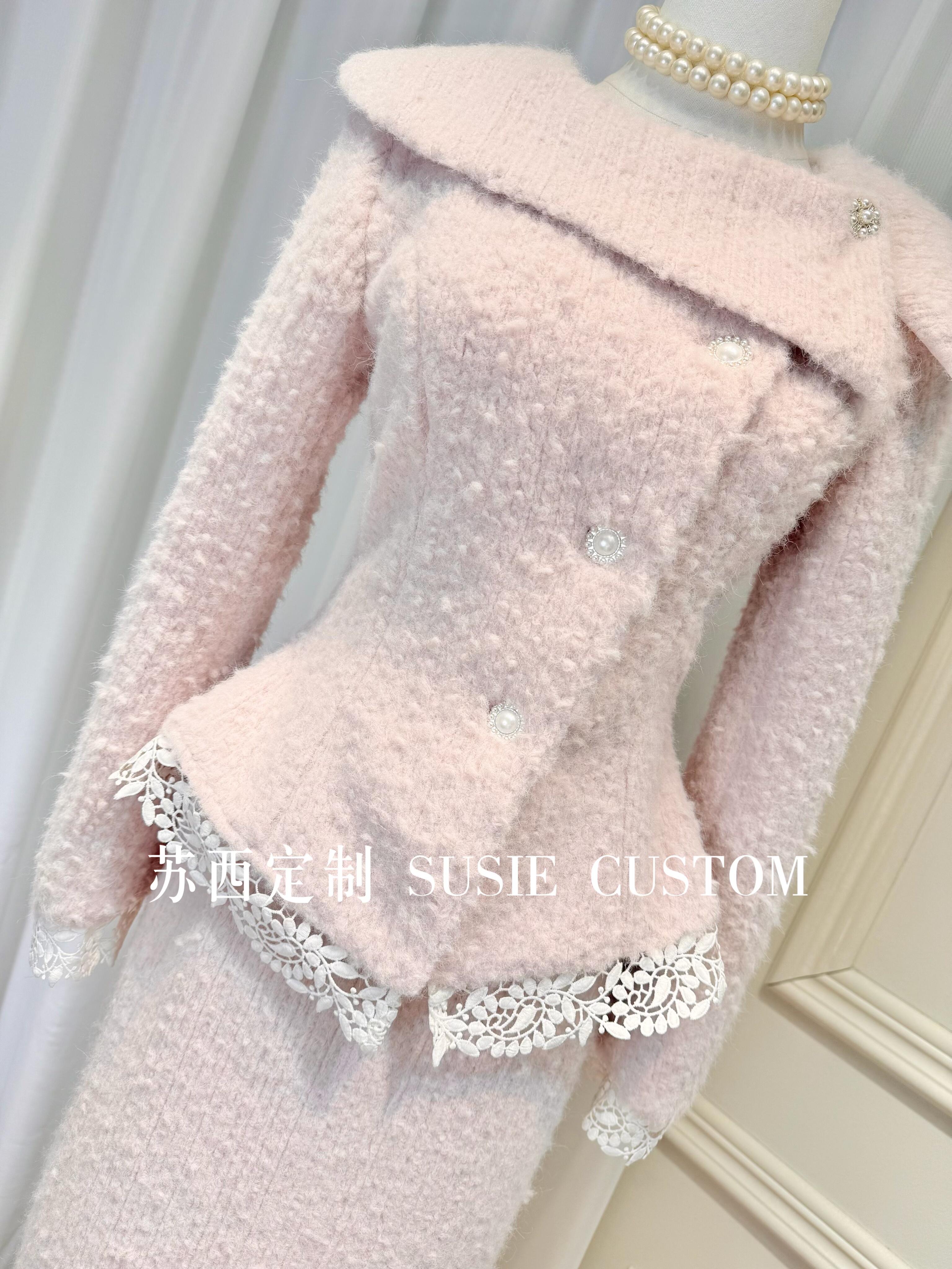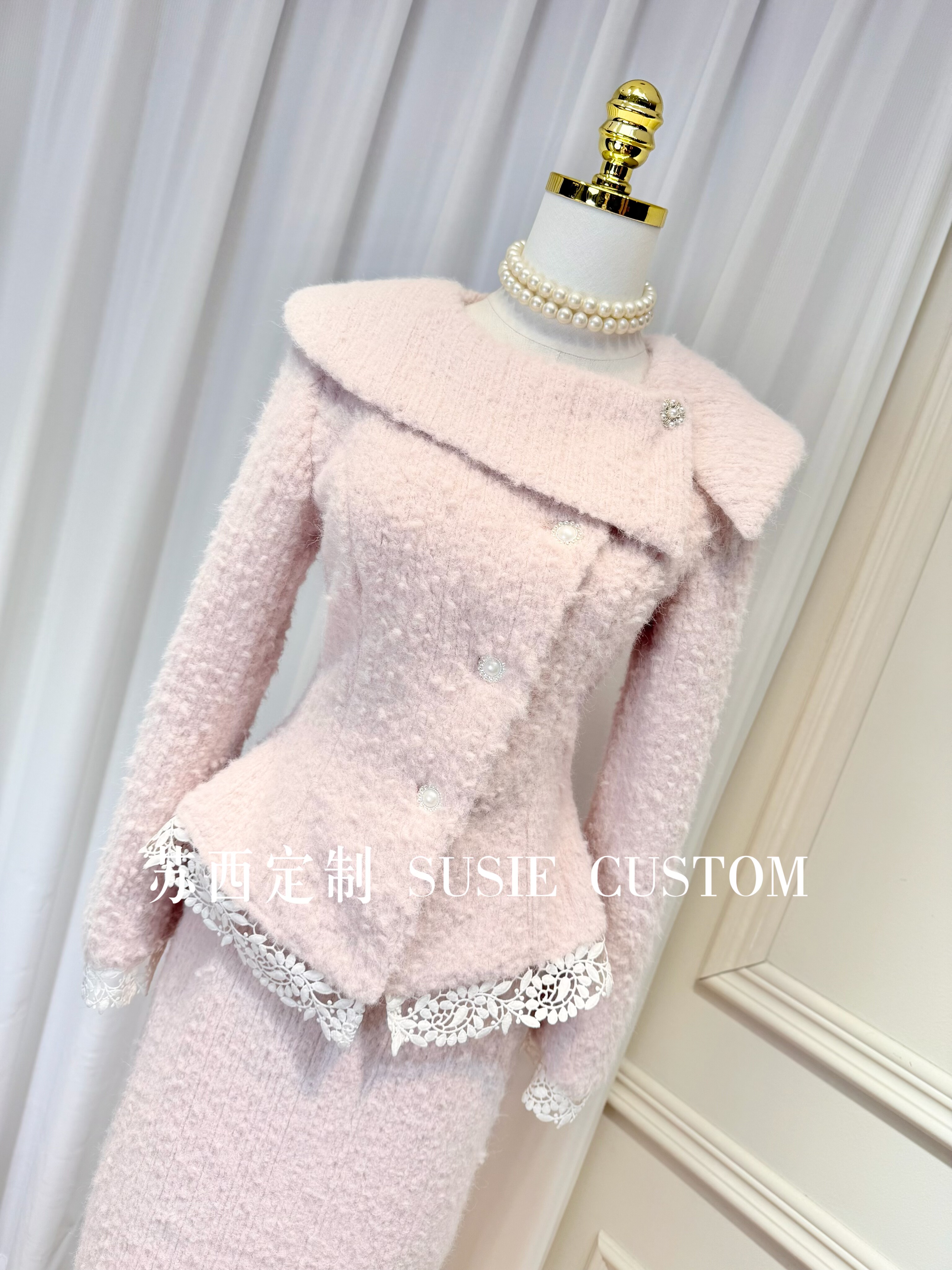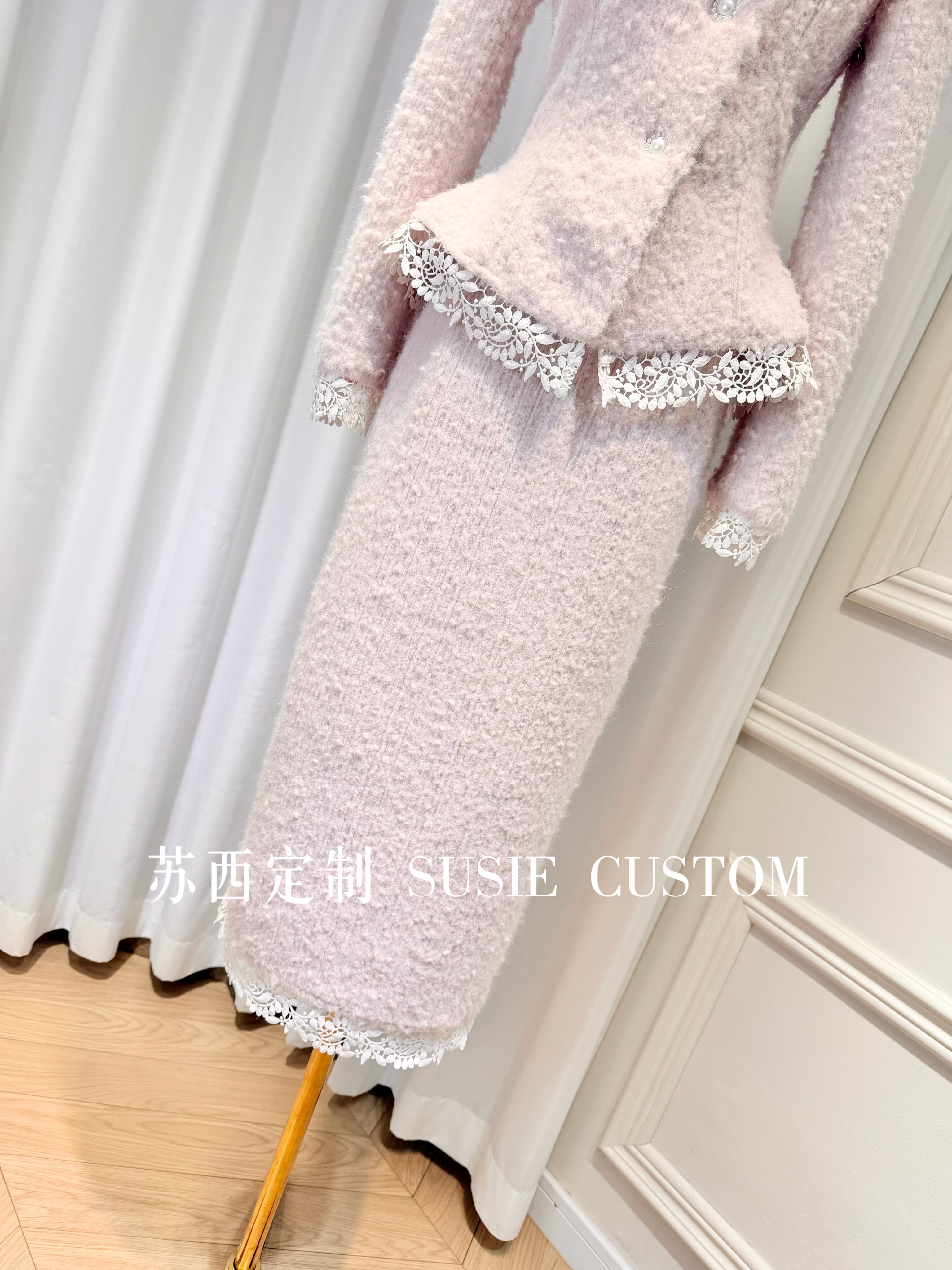 高定名媛千金风珠扣翻领蕾丝花边粗花呢小香外套中长款半裙套装
