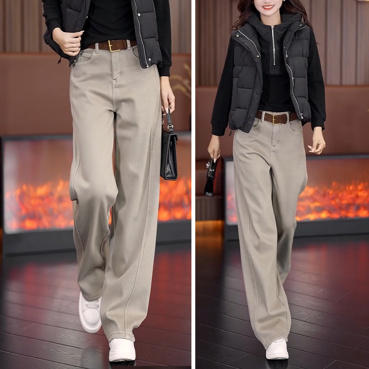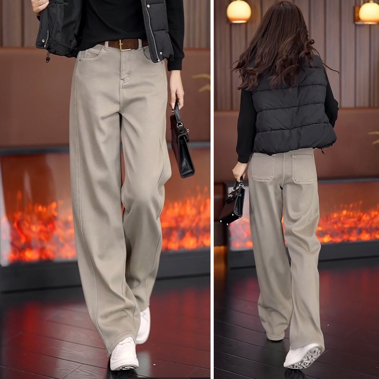 奶茶咖加绒牛仔裤女秋冬新爆款高腰显瘦窄版阔腿裤宽松直筒弯刀裤