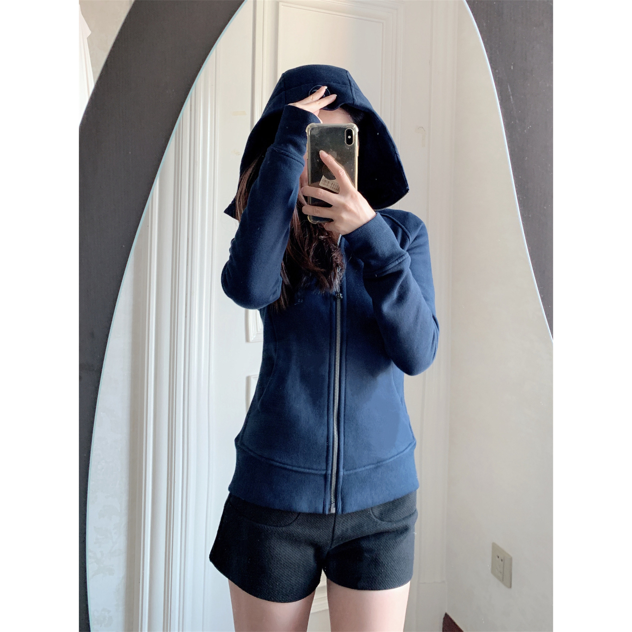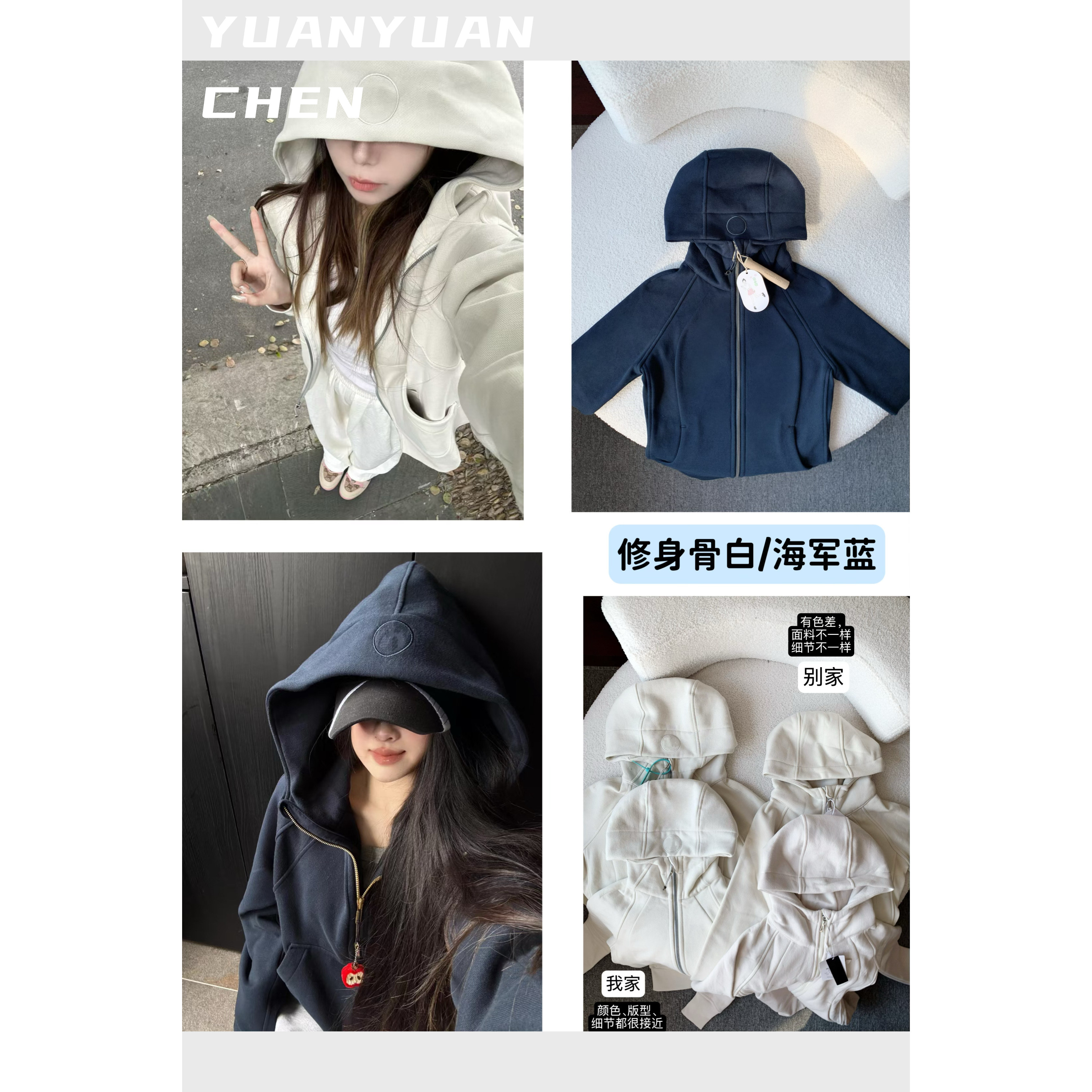 【陈小圆】韩国设计师修身版加绒卫衣骨白海军蓝连帽拉链开衫外套
