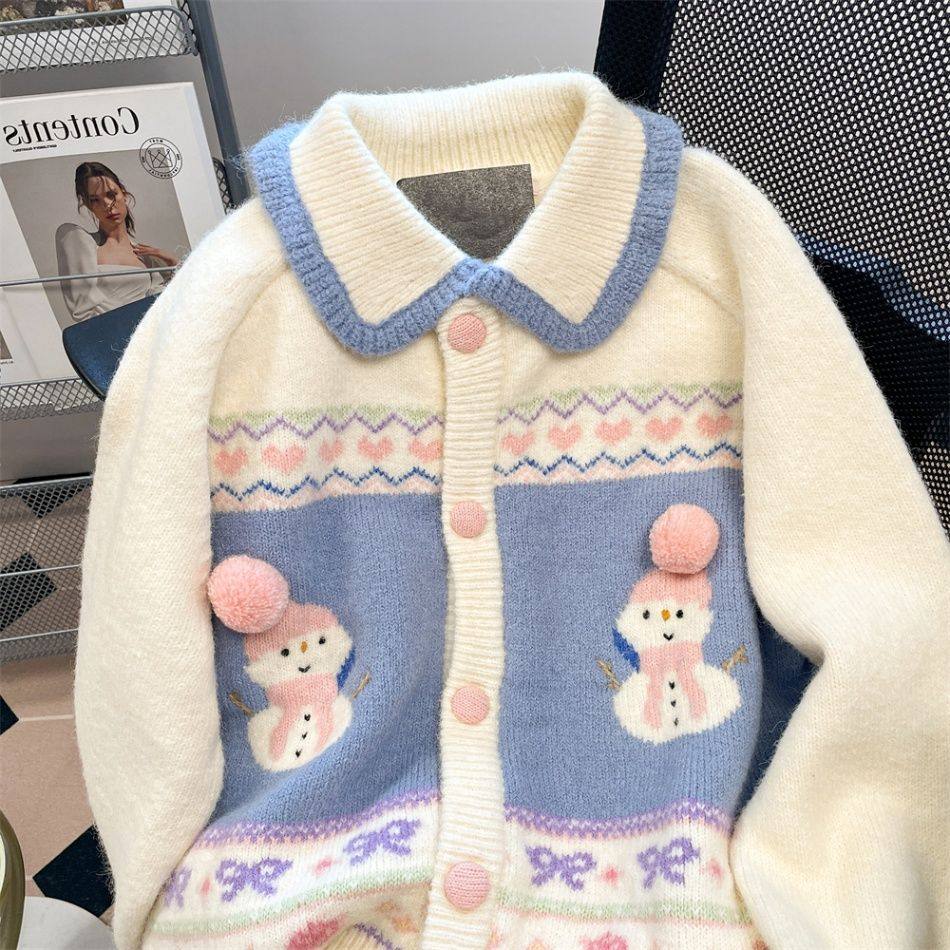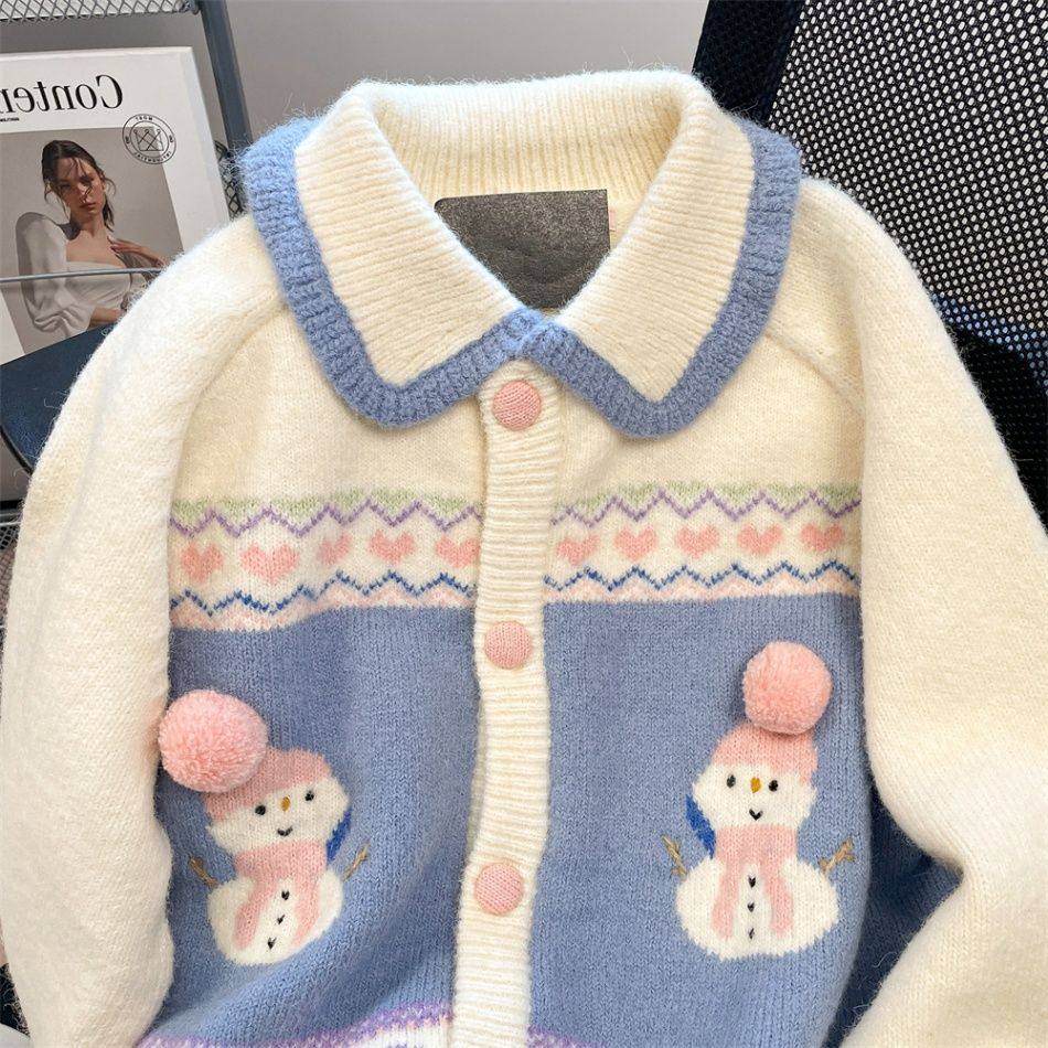 韩系甜美漂亮雪人毛衣开衫男女秋冬新款复古拼色加厚软糯针织外套