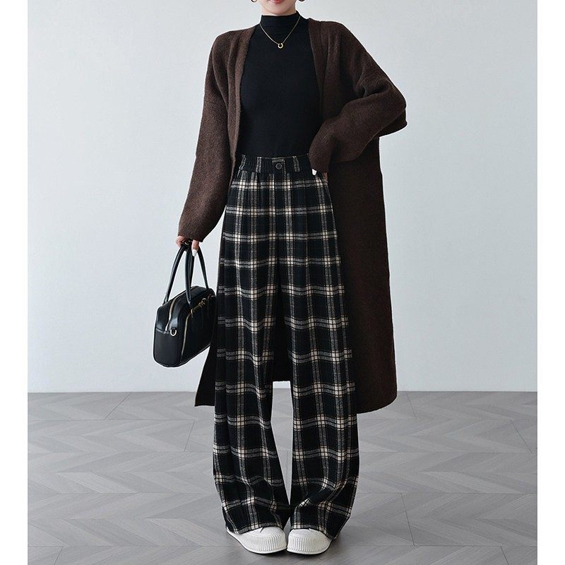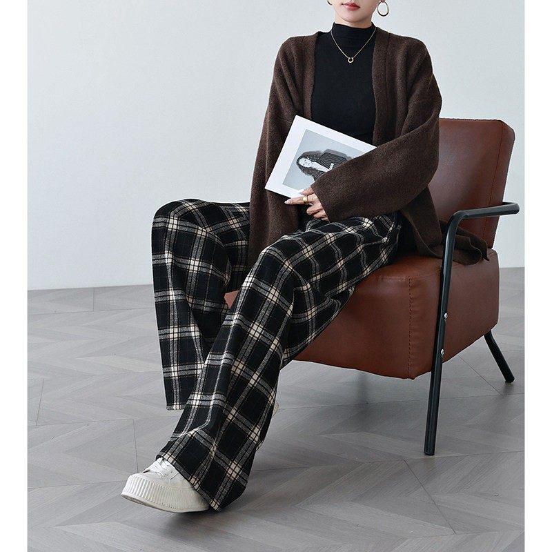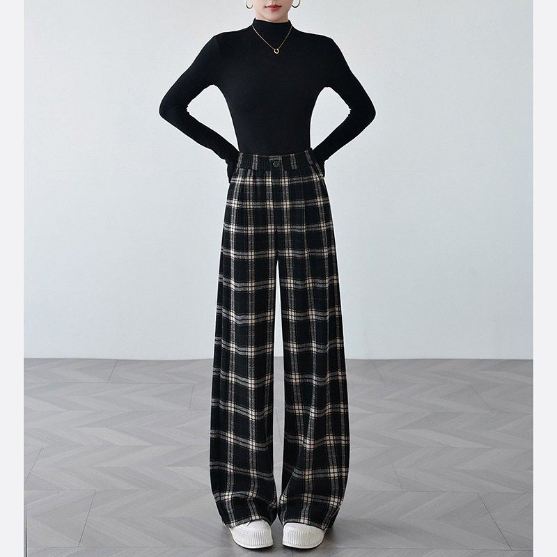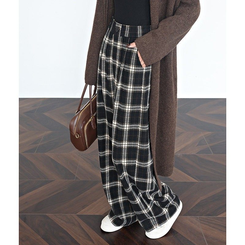 格子裤女春秋冬季加绒高腰宽松香蕉裤毛呢裤子醋酸羊毛阔腿裤
