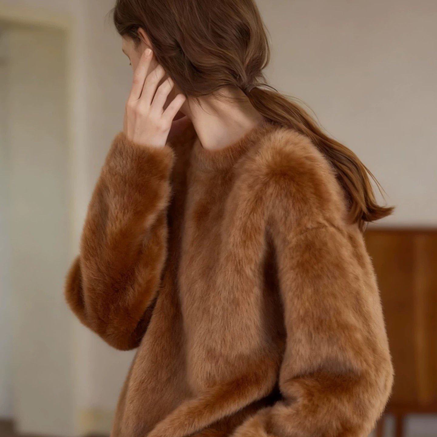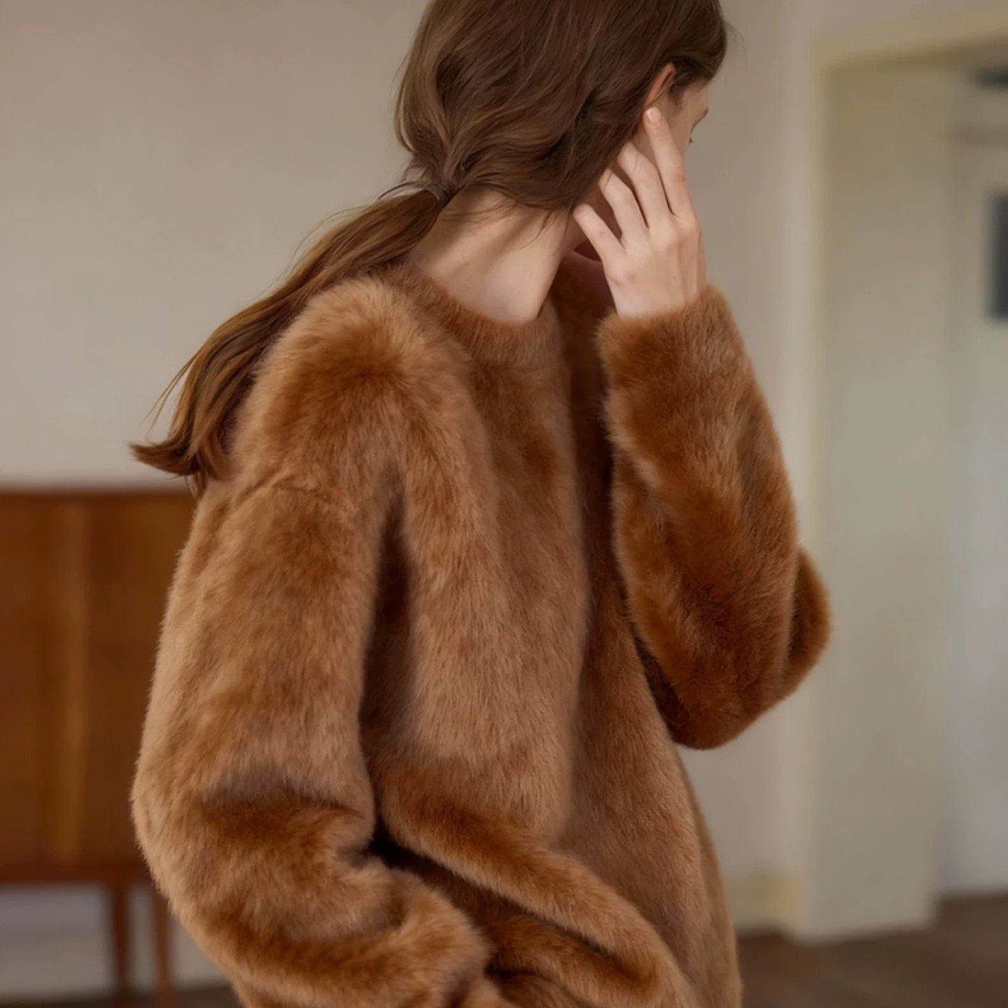 咖色拉绒仿水貂绒宽松加厚毛衣女款2025新款慵懒风巨好看轻熟上衣