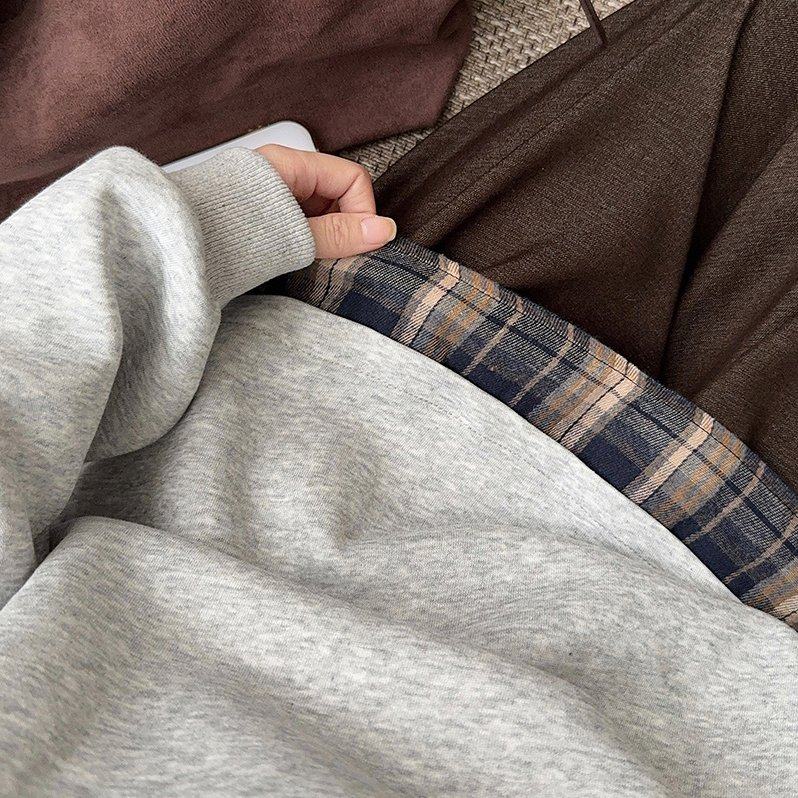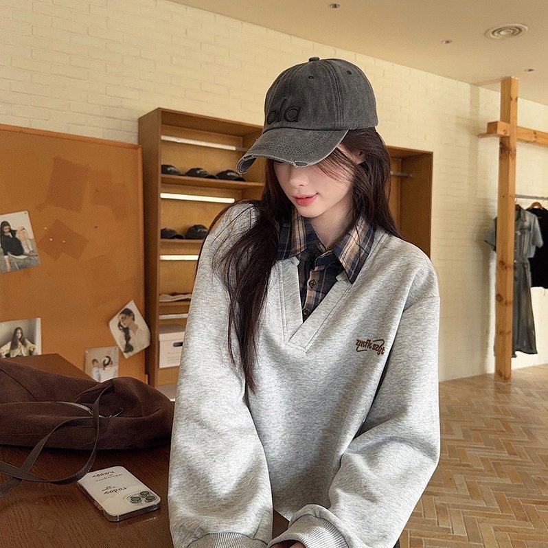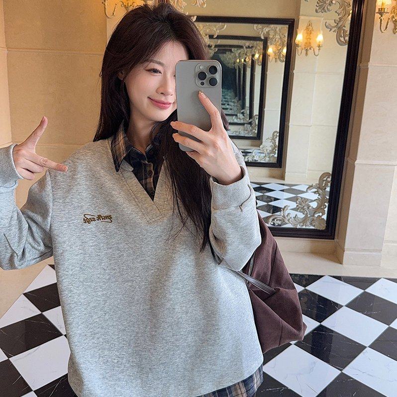 实拍长袖t恤卫衣假两件新款格子刺绣花春秋季宽松POLO领韩版上衣
