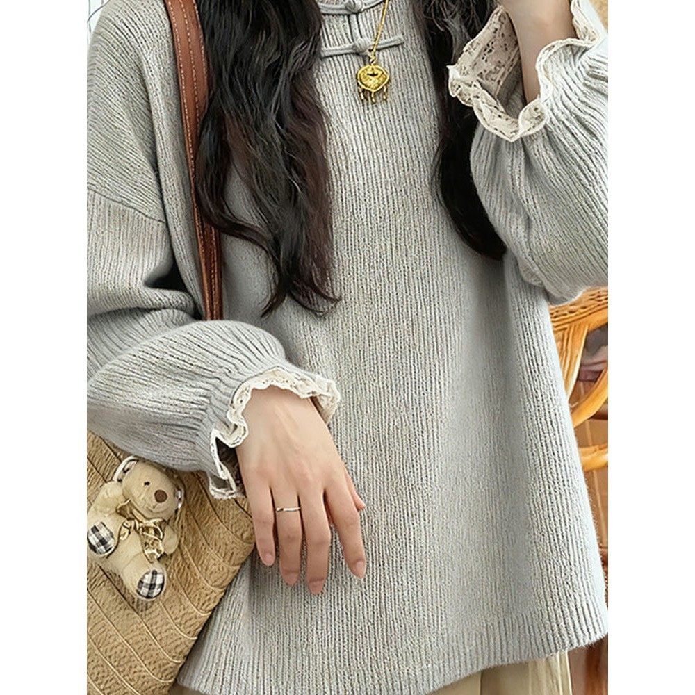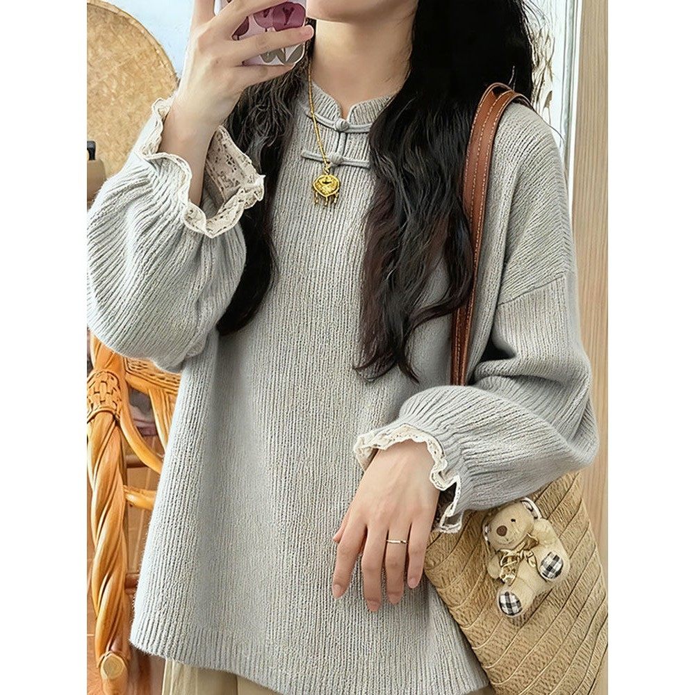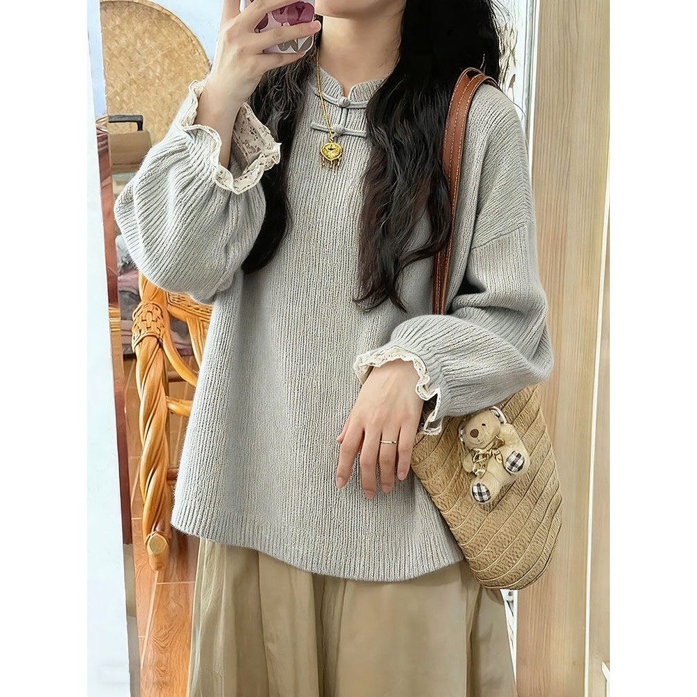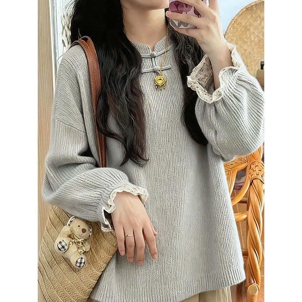 新中式轻国风灰色立领盘扣蕾丝拼接针织衫慵懒高级感毛衣2025秋季