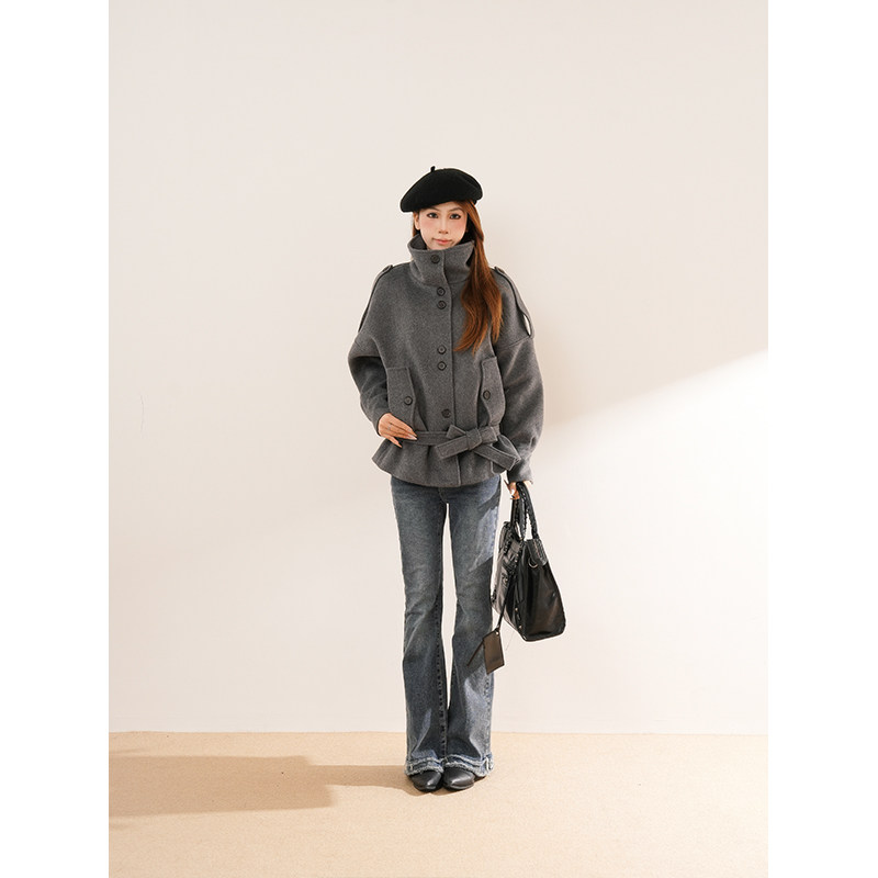 松间步月 韩系气质绑带收腰大衣2025冬季新款加厚立领外套上衣女
