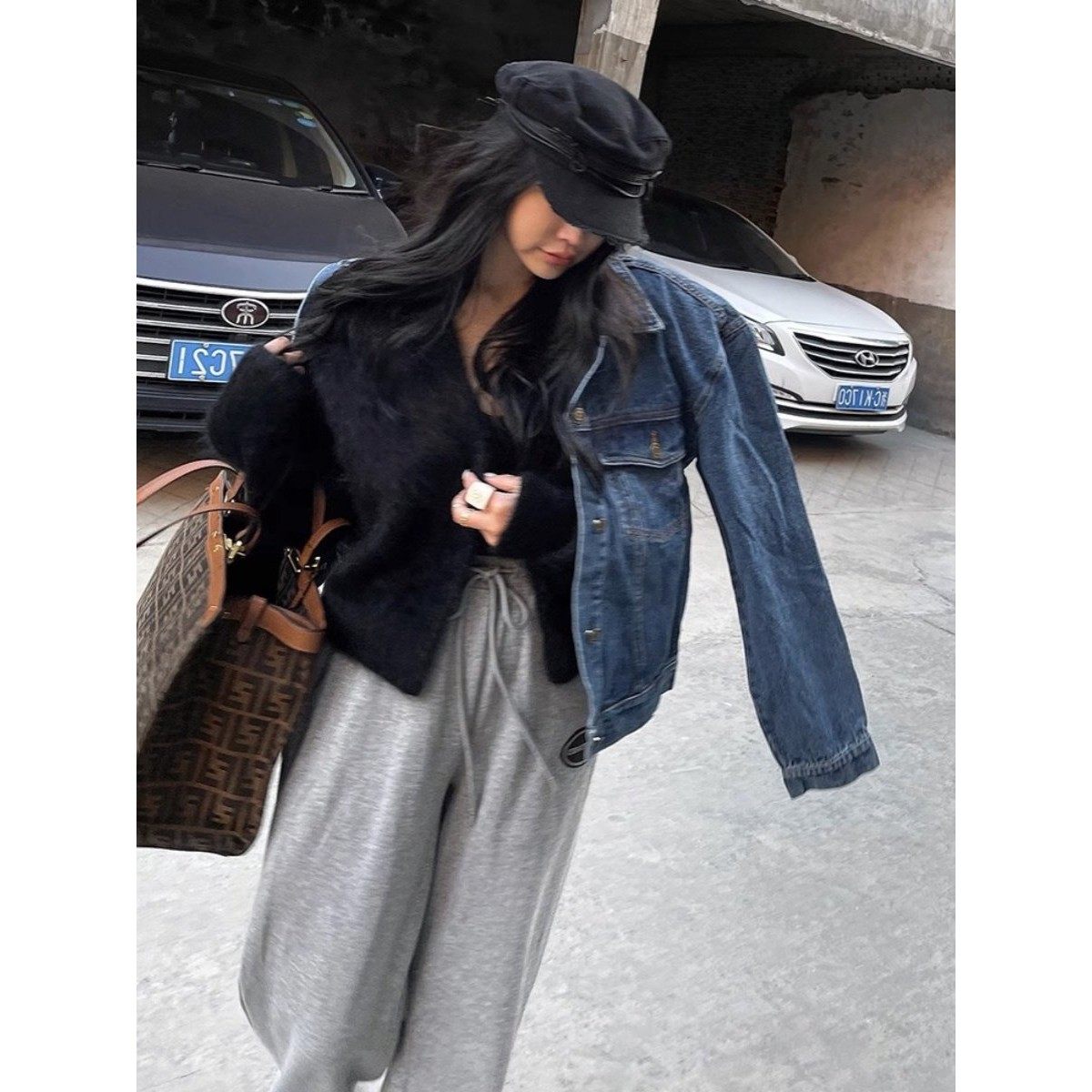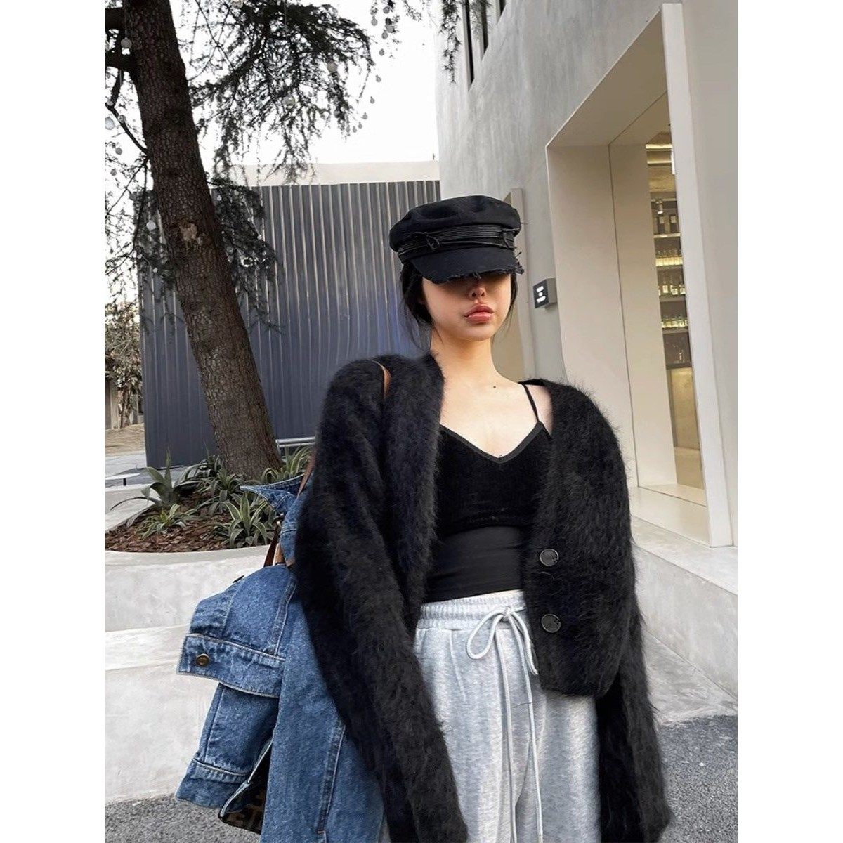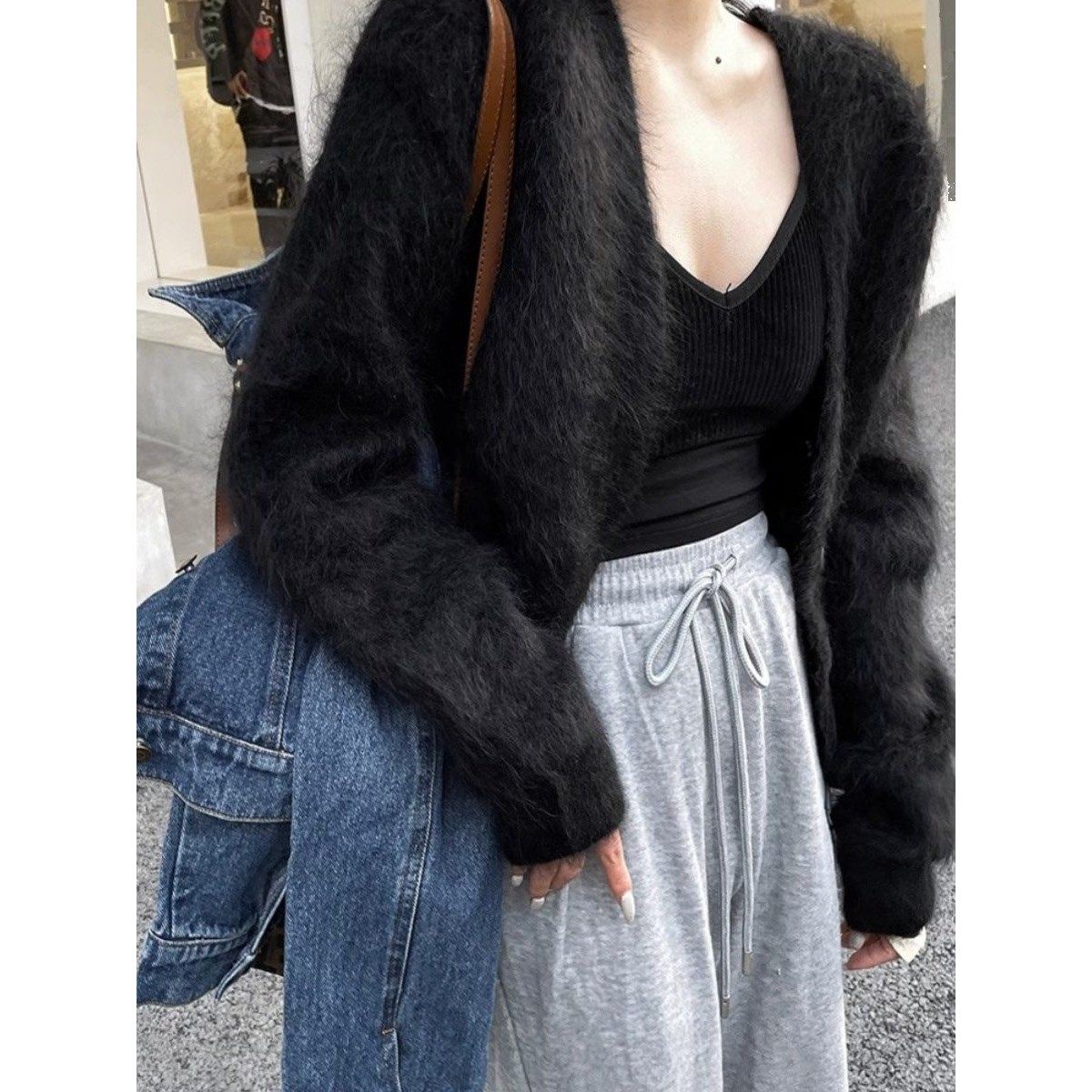 日本代购秋冬短款黑色水貂绒毛衣女慵懒风毛茸茸针织开衫上衣外套