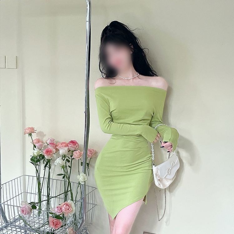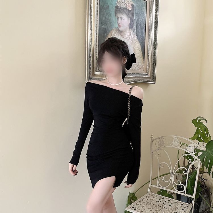 早秋气质黑色夜场性感女装紧身裙子一字肩长袖小妈包臀连衣裙短裙
