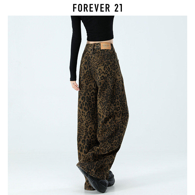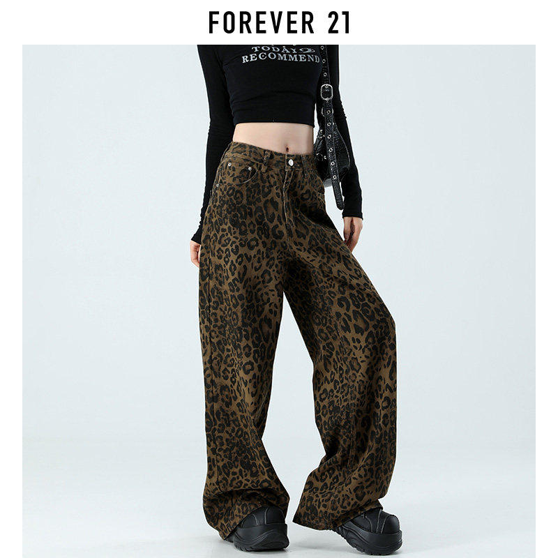 Forever 21美式豹纹阔腿牛仔裤女春季新款高腰显瘦宽松直筒拖地裤
