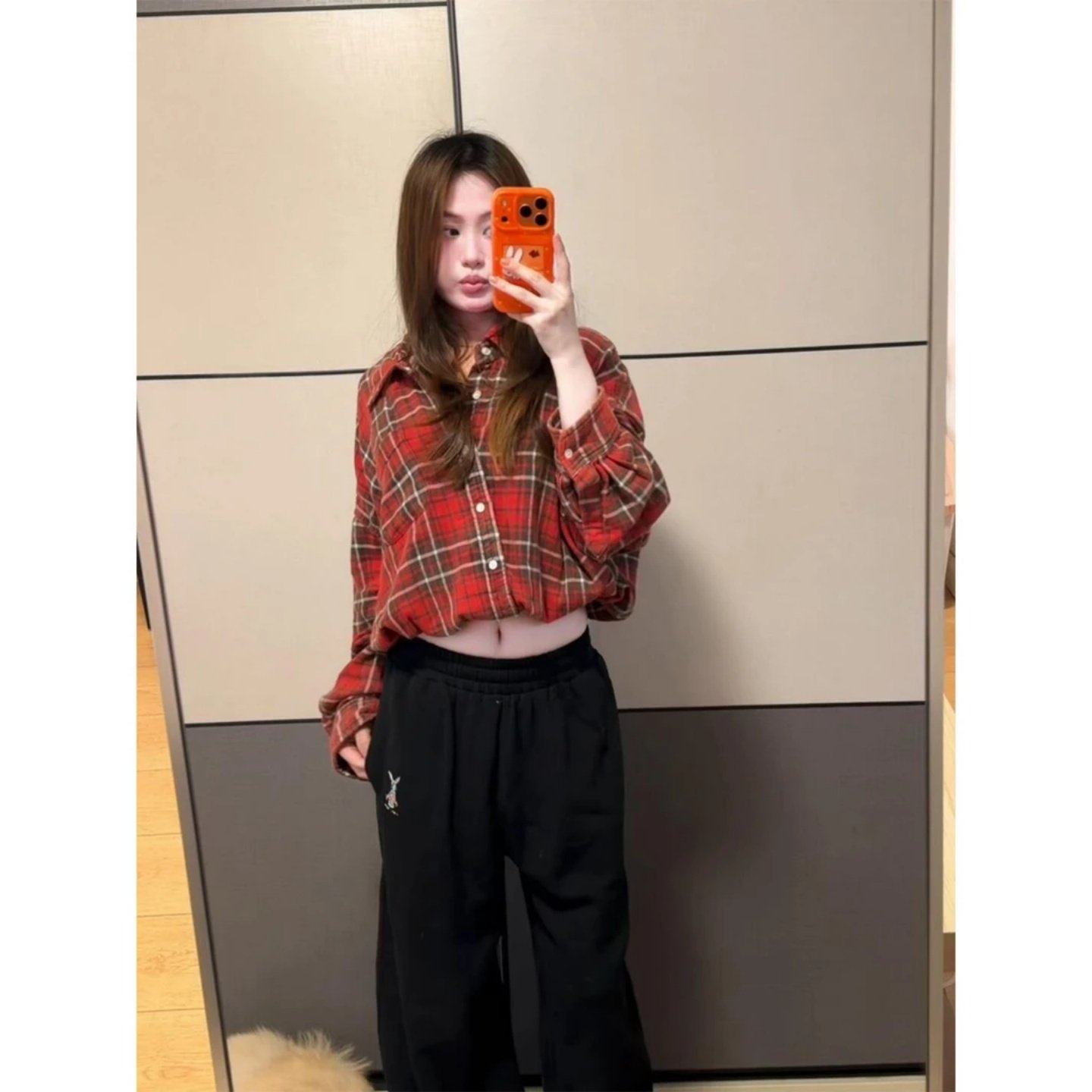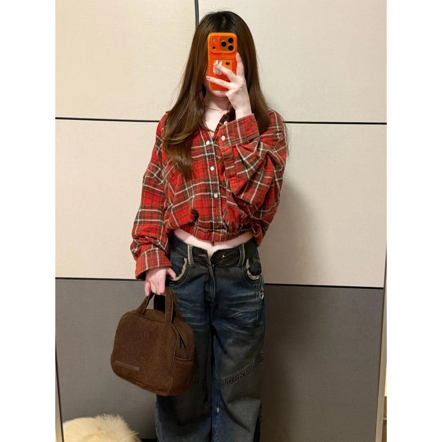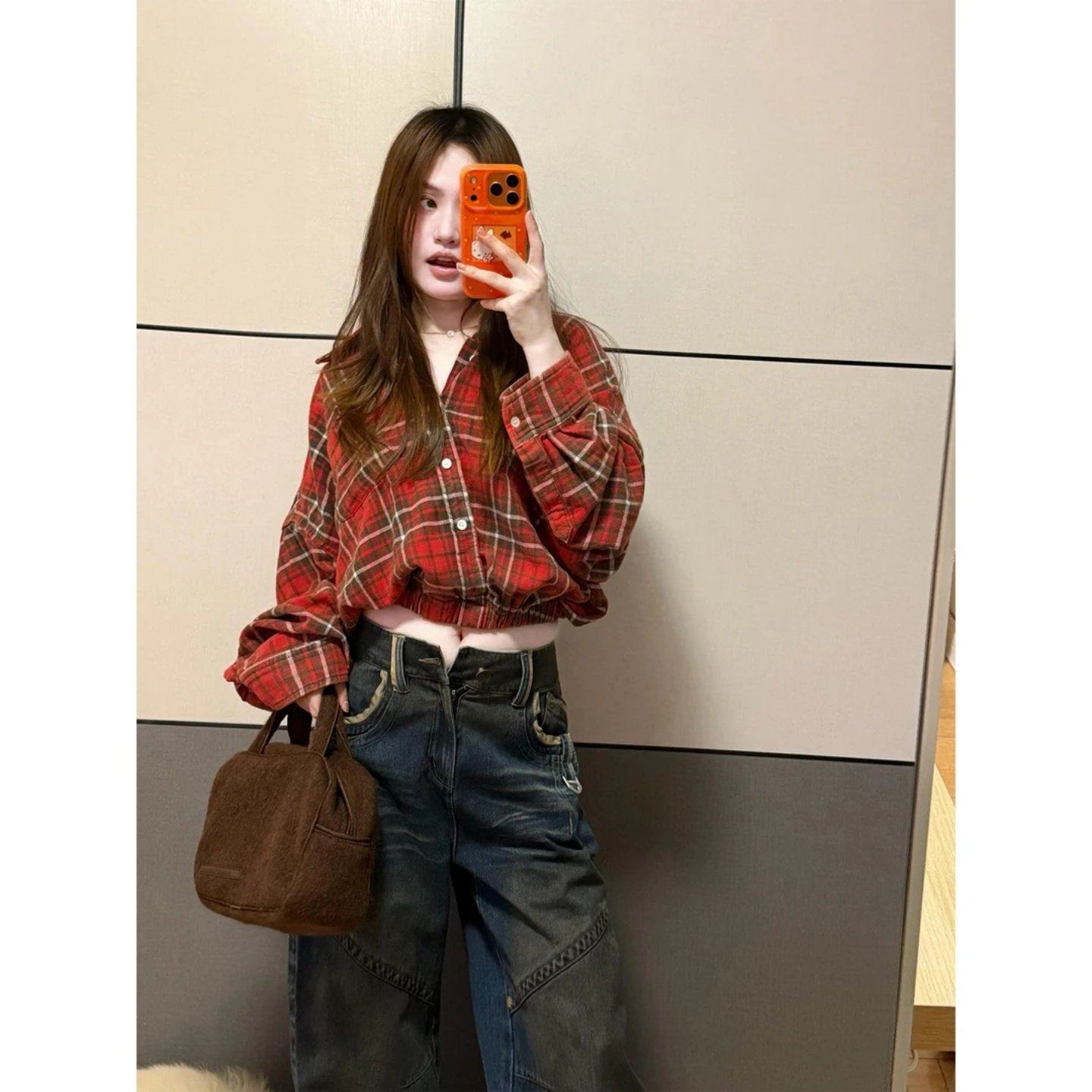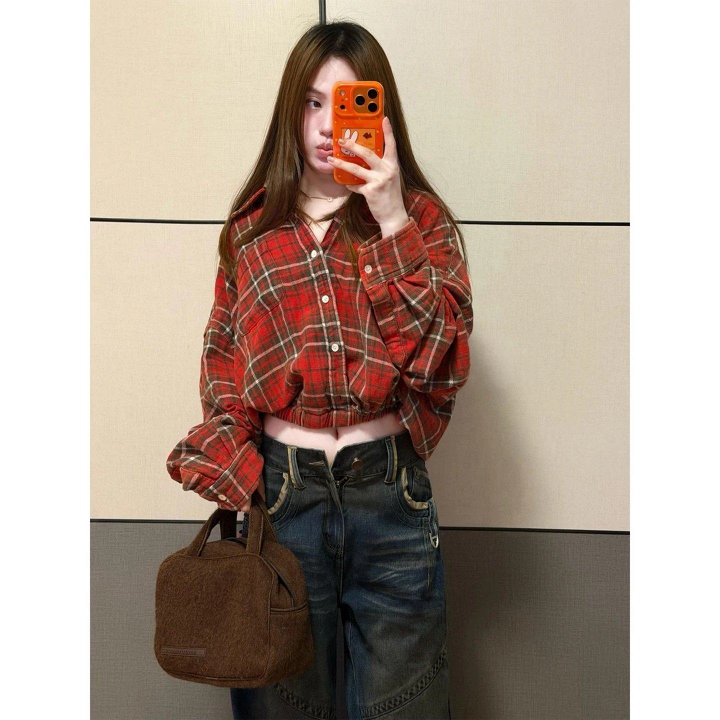 小众时髦设计感格纹短款长袖衬衫2026春季新款百搭翻领收腰上衣