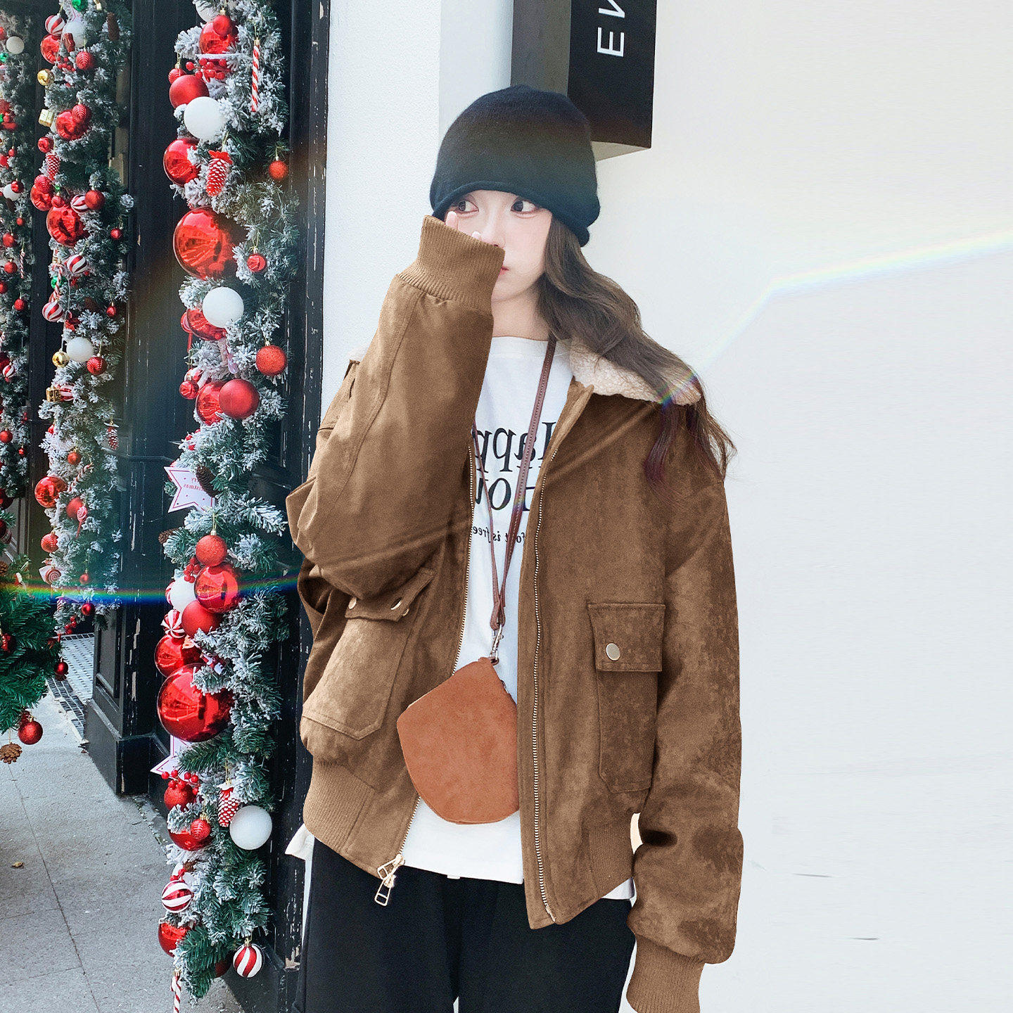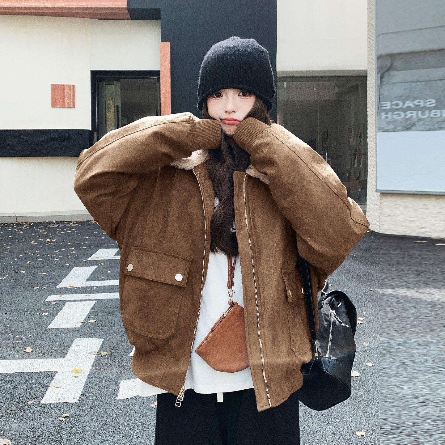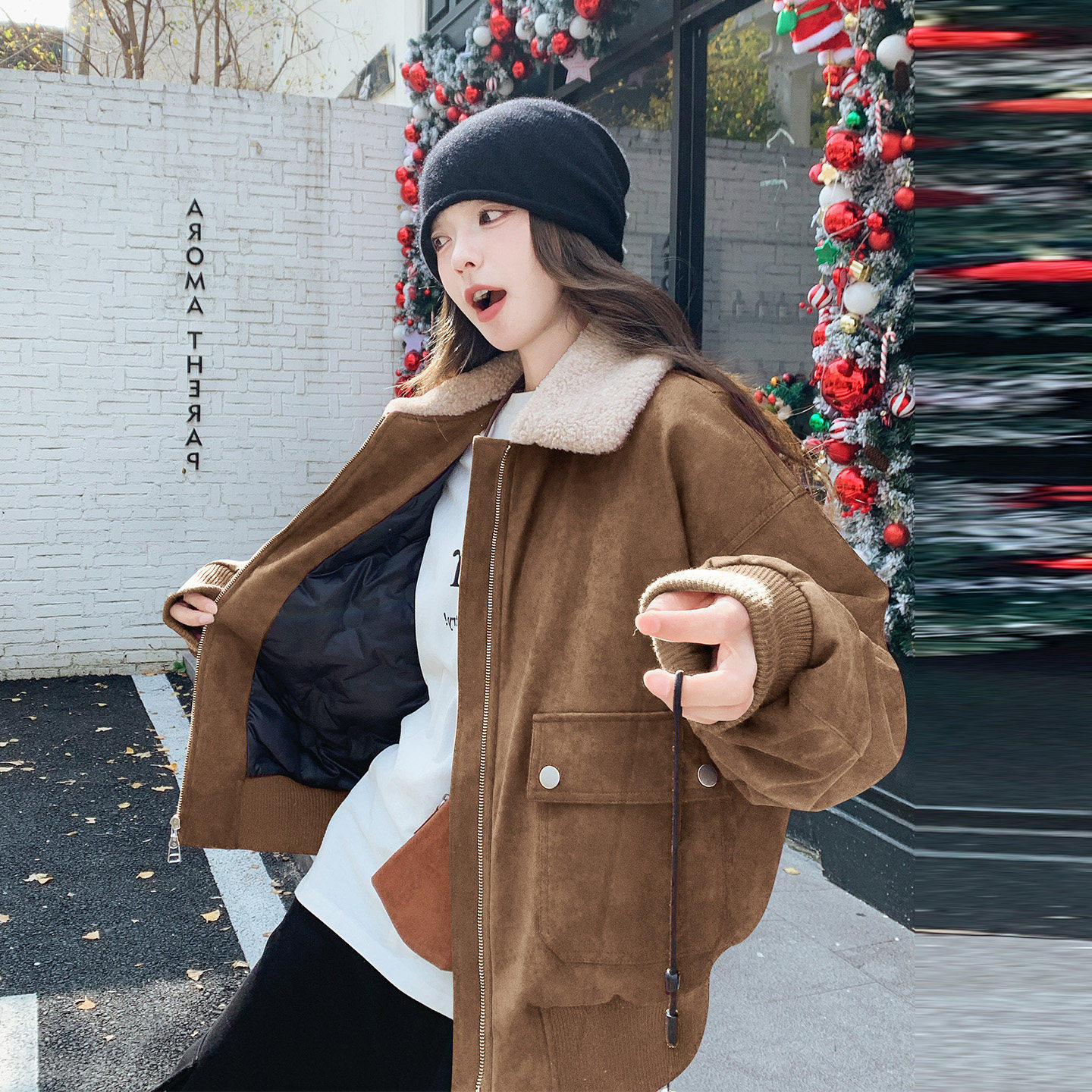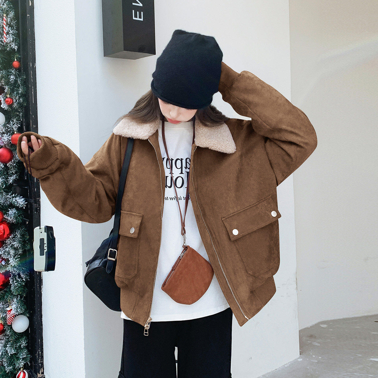 复古羊羔毛领麂皮绒短款羽绒服女2025冬韩系洋气时髦90白鸭绒外套