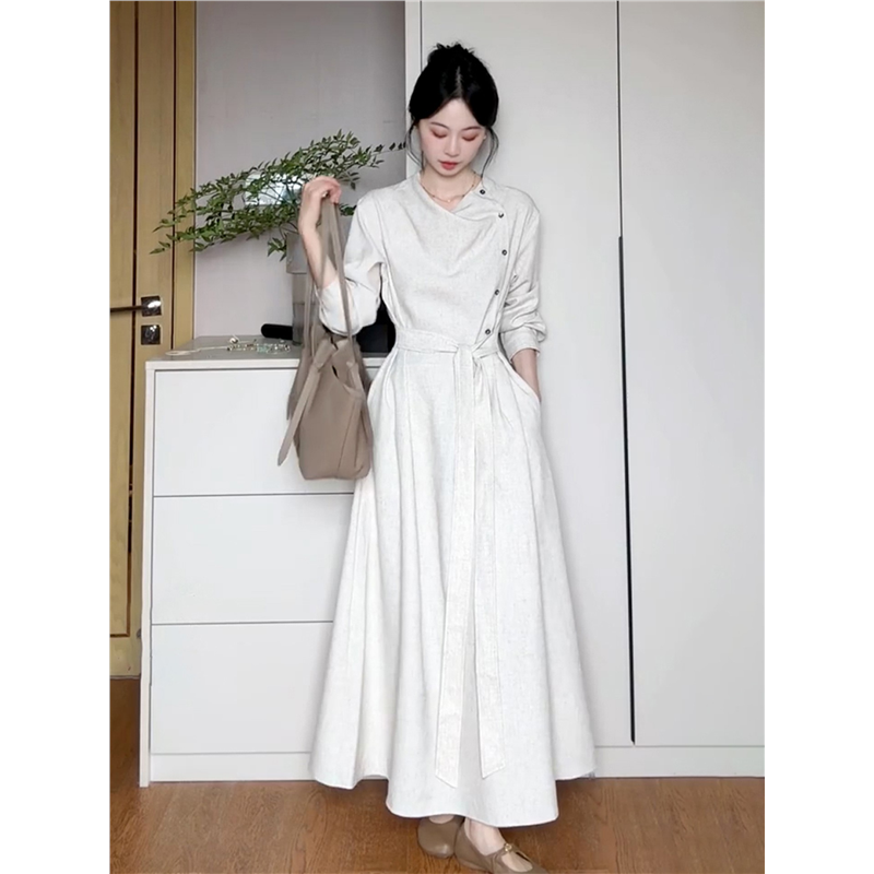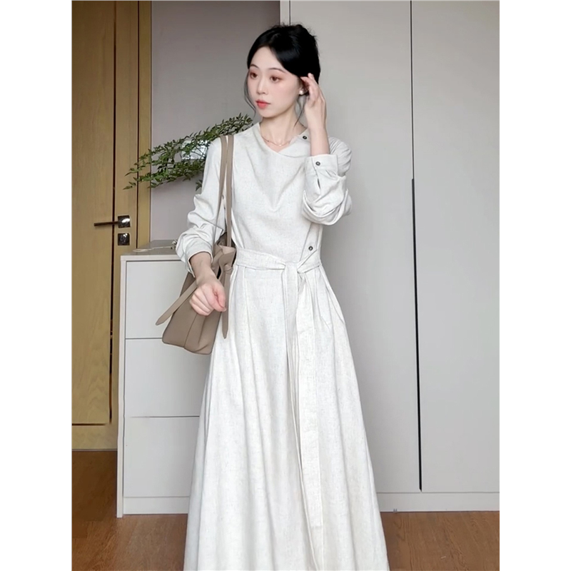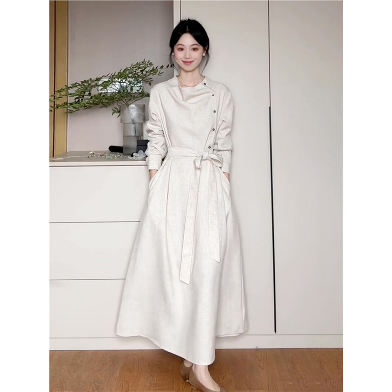 2025早秋新款法式慵懒长袖连衣裙堆堆领气质淡人高知老钱风穿搭