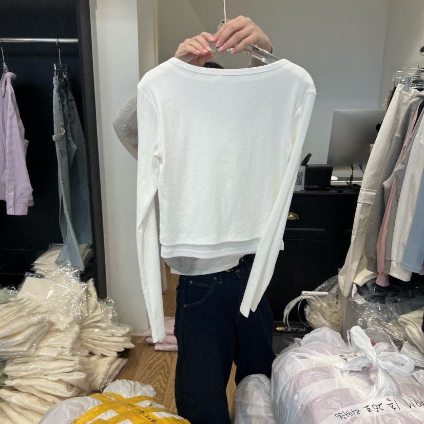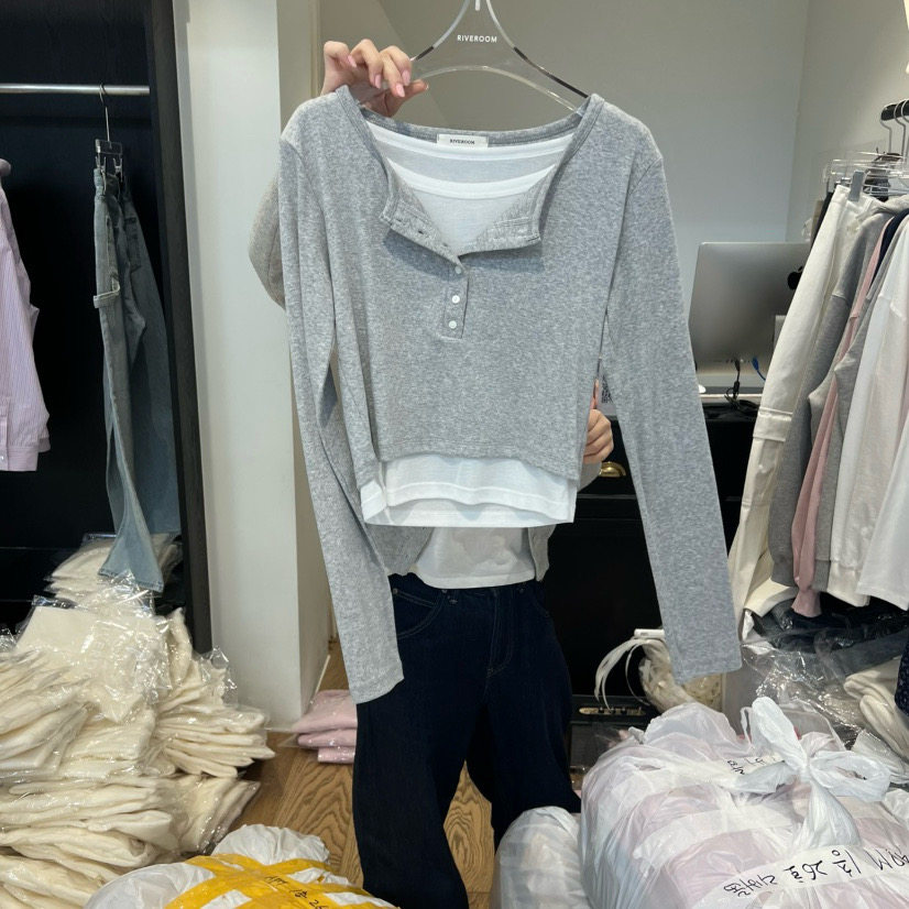 韩国东大门RIVEROOM 2026春季新款假两件别致纽扣半开领打底T恤