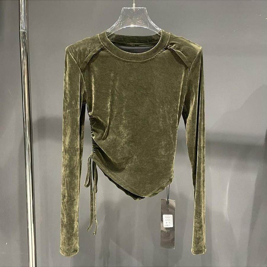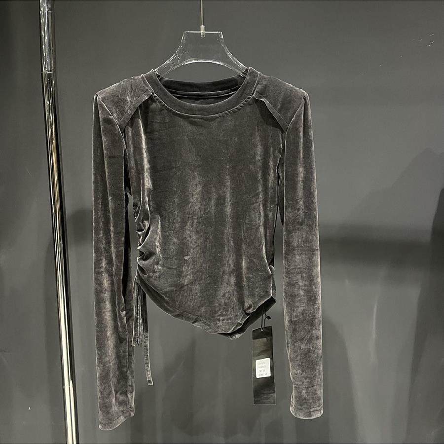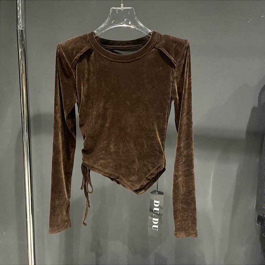 首页> 女装> 韩国不规则圆领长袖T恤女春秋新款设计感修身金丝绒抽绳短款上衣